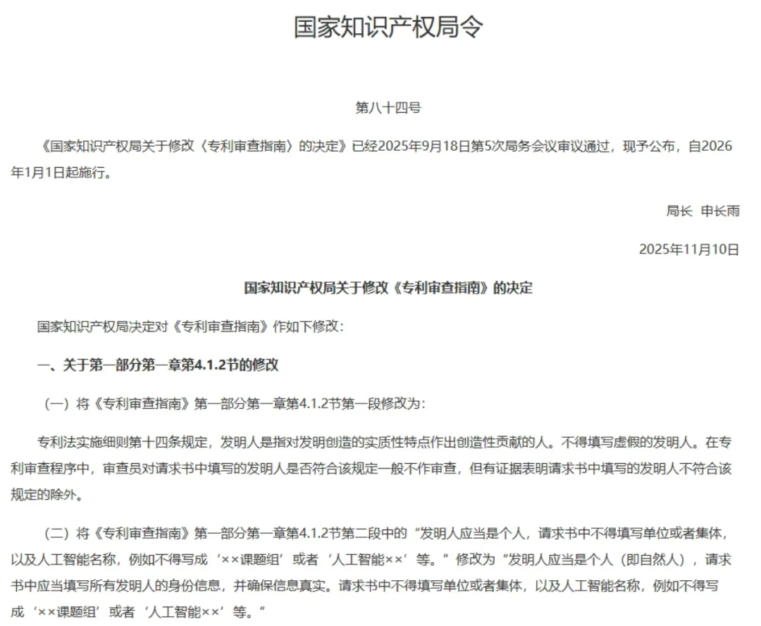 新修订的《专利审查指南》明确:AI不能作为发明人。