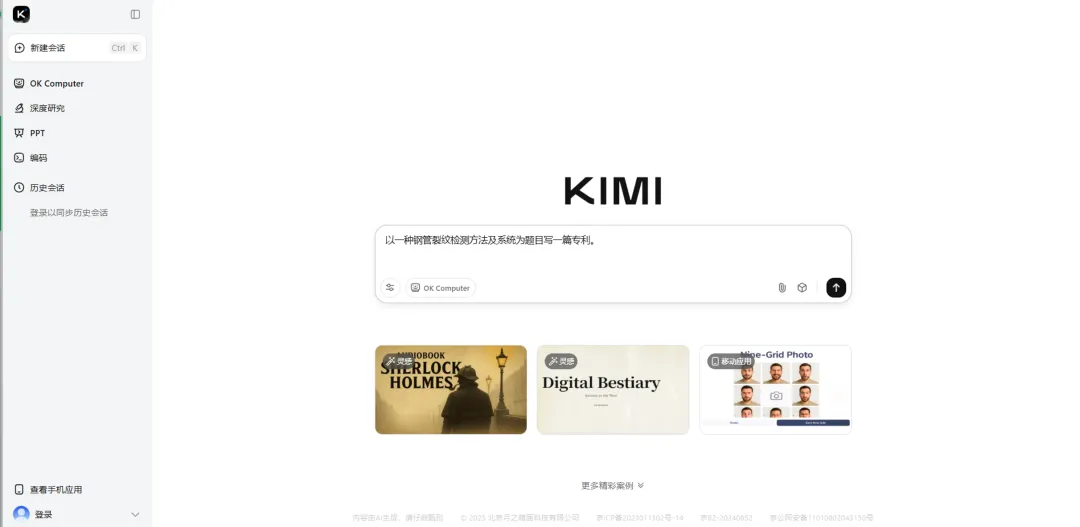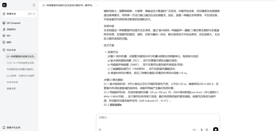 ai率太高,是因为ai不懂人类撰写专利的风格与格式。我们以专利名称:一种钢管裂纹检测方法及系统 为例,试试用kimi这类通用AI进行专利五书撰写。