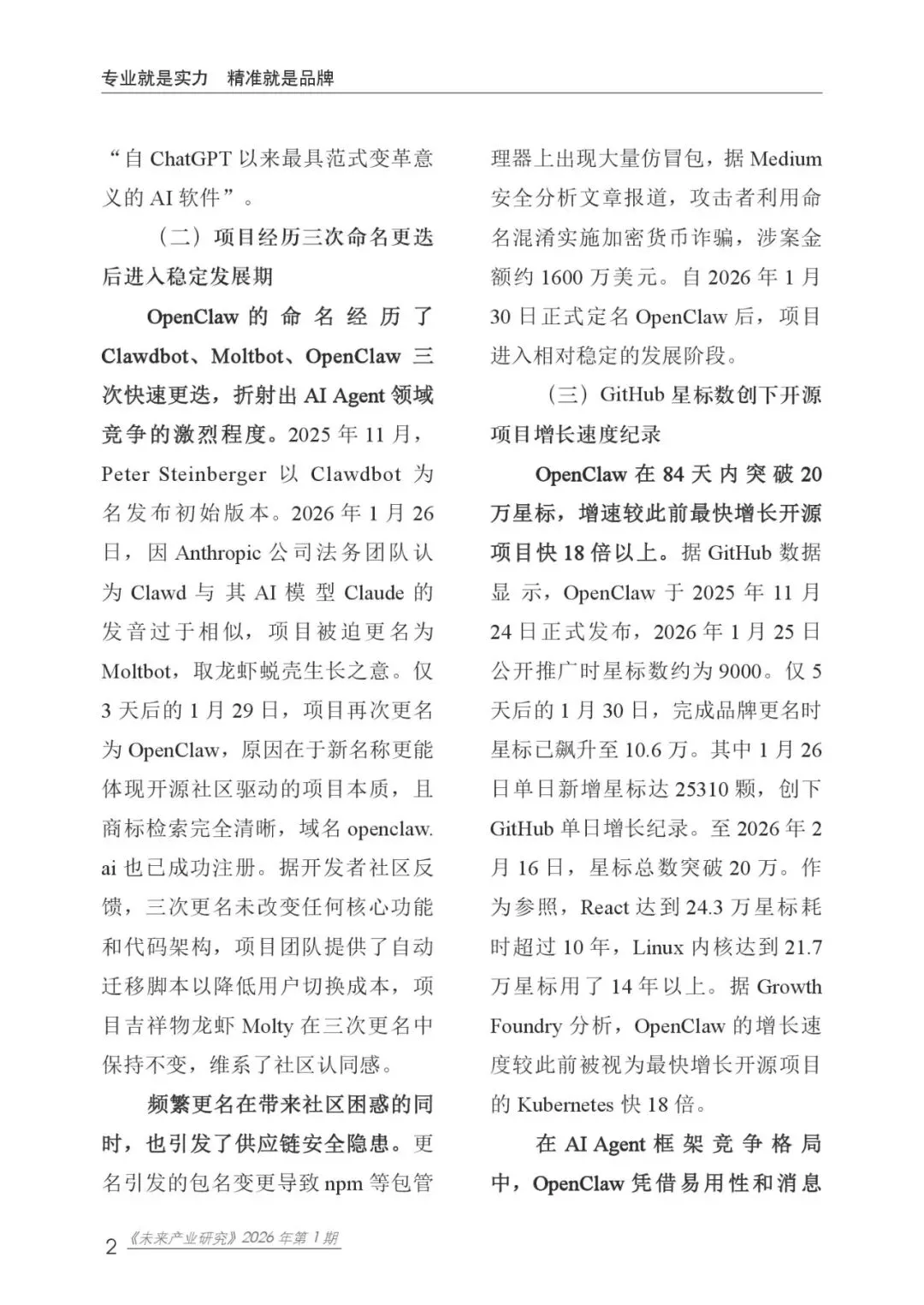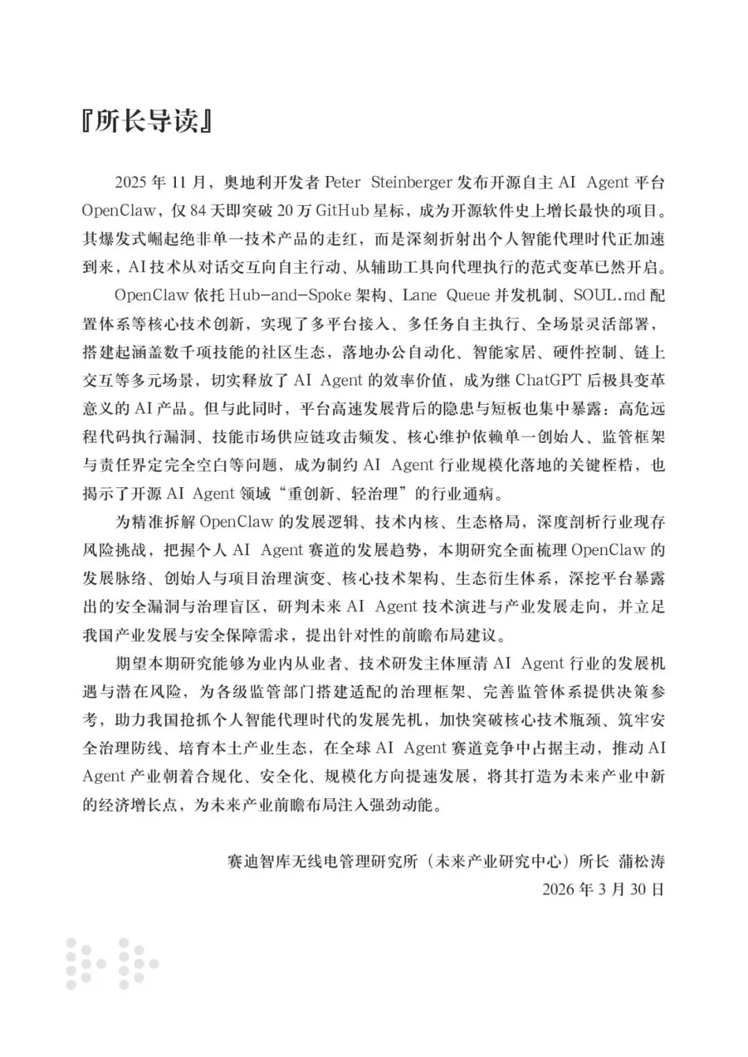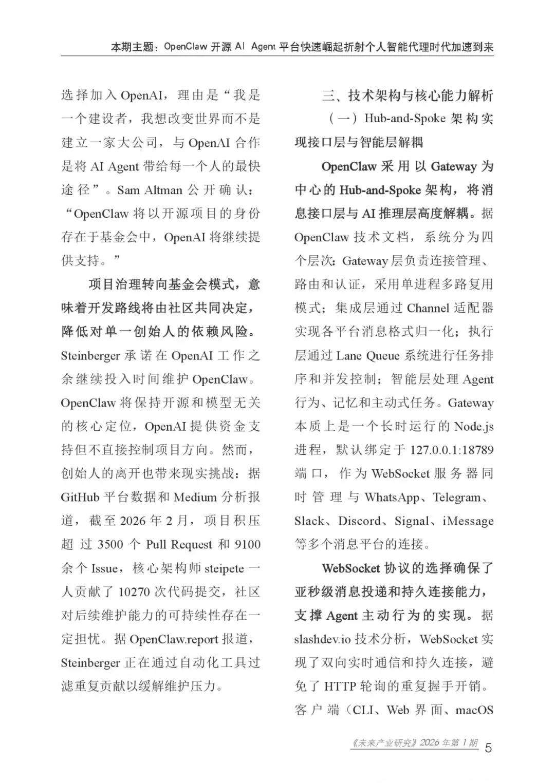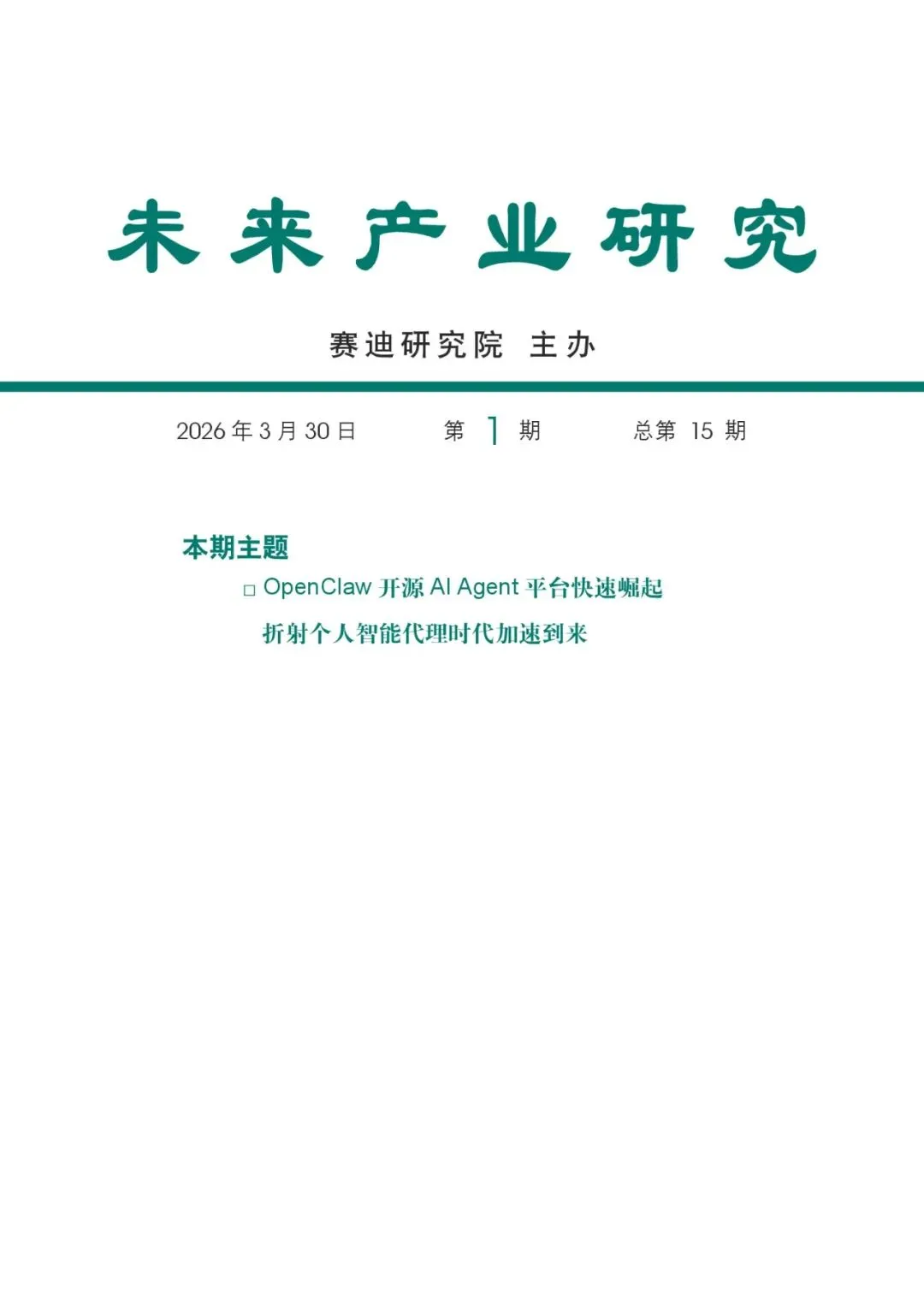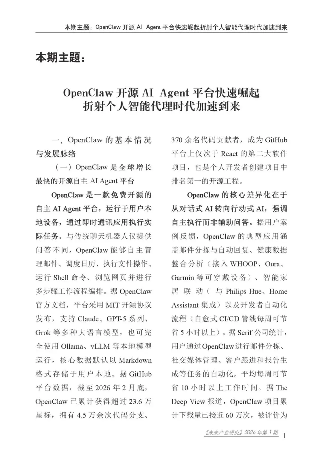 《未来产业研究》本期聚焦“OpenClaw 开源 AI Agent 平台快速崛起折射个人智能代理时代加速到来”这一主题,深入分析了OpenClaw的技术架构、生态发展、安全风险及治理挑战,并为我国AI Agent产业的前瞻布局提出建议。