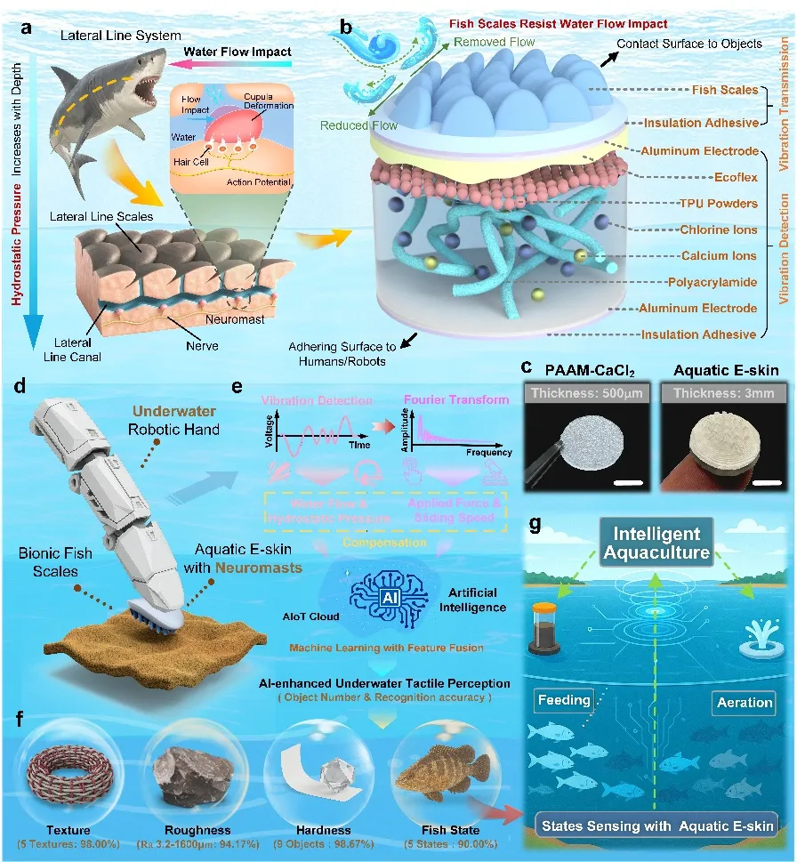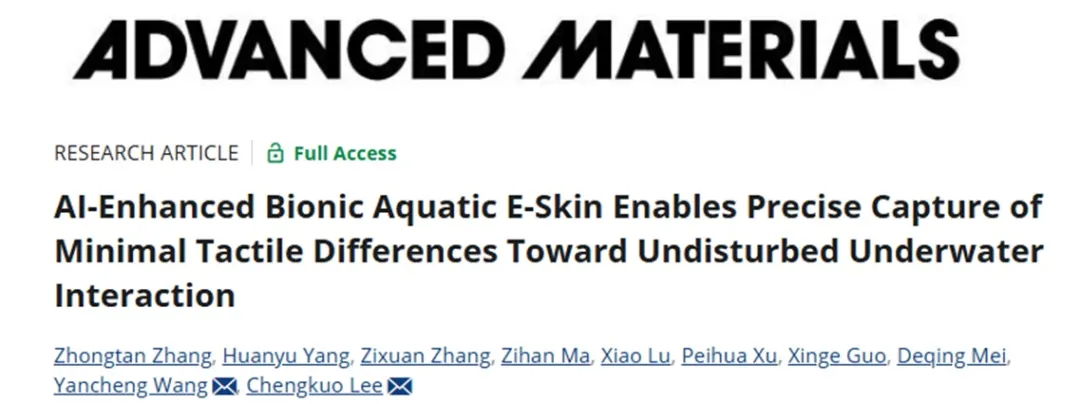 近日,浙江大学机械工程学院汪延成教授团队联合新加坡国立大学电子与计算机工程系 Chengkuo Lee教授在《Advanced Materials》发表题为“AI-Enhanced Bionic Aquatic E-Skin Enables Precise Capture of Minimal Tactile Differences Toward Undisturbed Underwater Interaction”的研究成果:一种受鲨鱼启发的仿生水下电子皮肤。