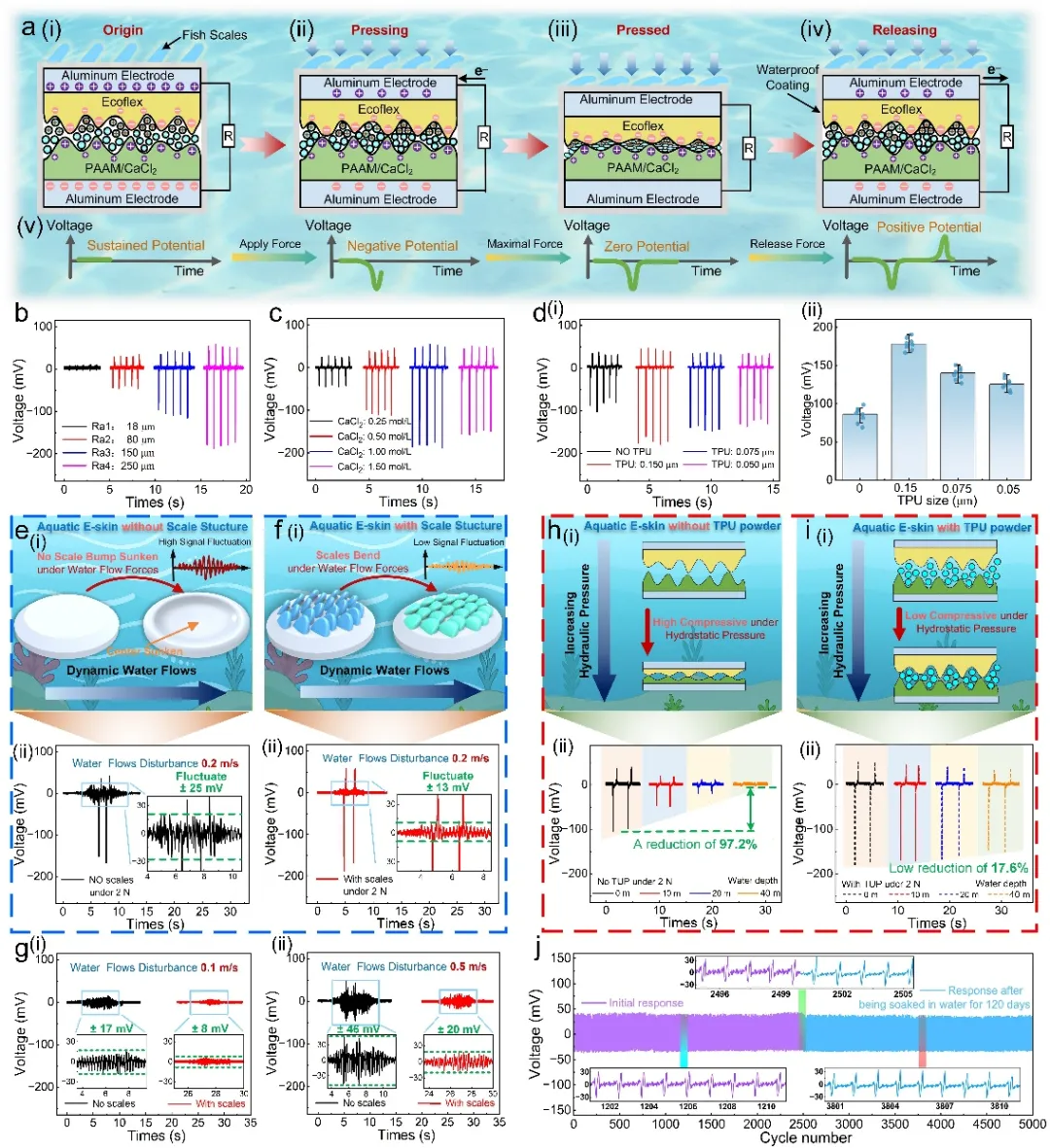 实验数据很直观,在每秒0.2米的水流中,没有仿生鳞片的传感器基线波动高达±25毫伏;加上鳞片后,波动降至±13毫伏,噪声几乎减半。即使在每秒0.5米的较强水流中,波动也能控制在±20毫伏以内。