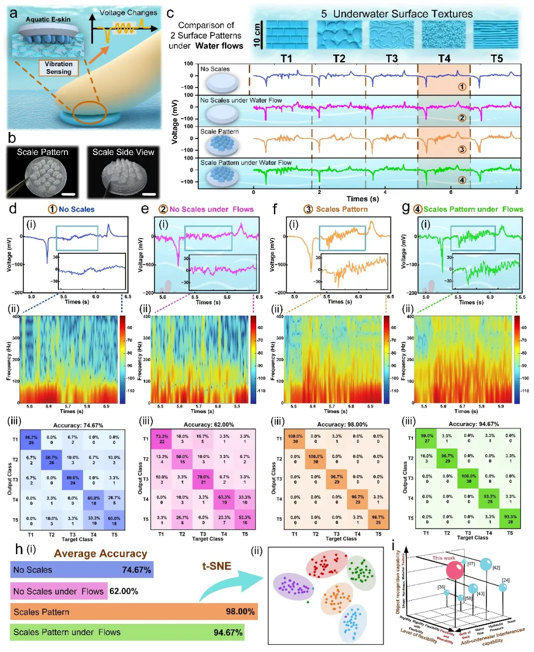 两种视角互补,大大提升了对微小差异的分辨能力。在静态水下,带有仿生鳞片的电子皮肤识别五种不同纹理的平均准确率高达98%。当水流开启,准确率依然保持在94.67%。而没有仿生鳞片的对照设备,静态水下只有74.67%,水流中更是跌至62%。