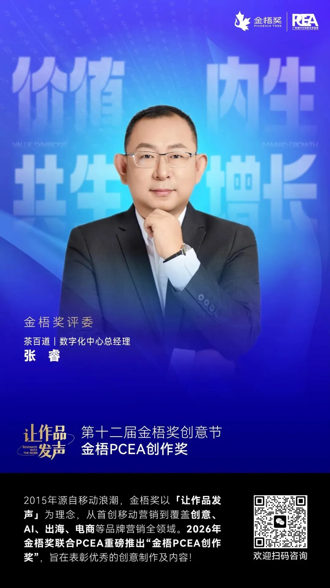 本届金梧奖我们很荣幸的邀请了茶百道数字化中心总经理 张睿先生加入第十二届金梧奖CMO评审团,与我们共同见证2026年营销创意标杆作品以及优秀服务机构的诞生,引领行业发展。