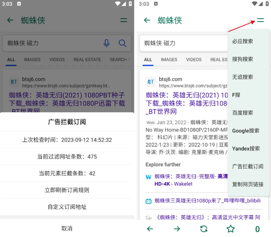 刚才提到的搜索引擎,在浏览器右上角点击双横线即可更换搜索引擎,而且还内置了广告拦截功能,所以也不用担心浏览器中充斥着一堆广告内容。