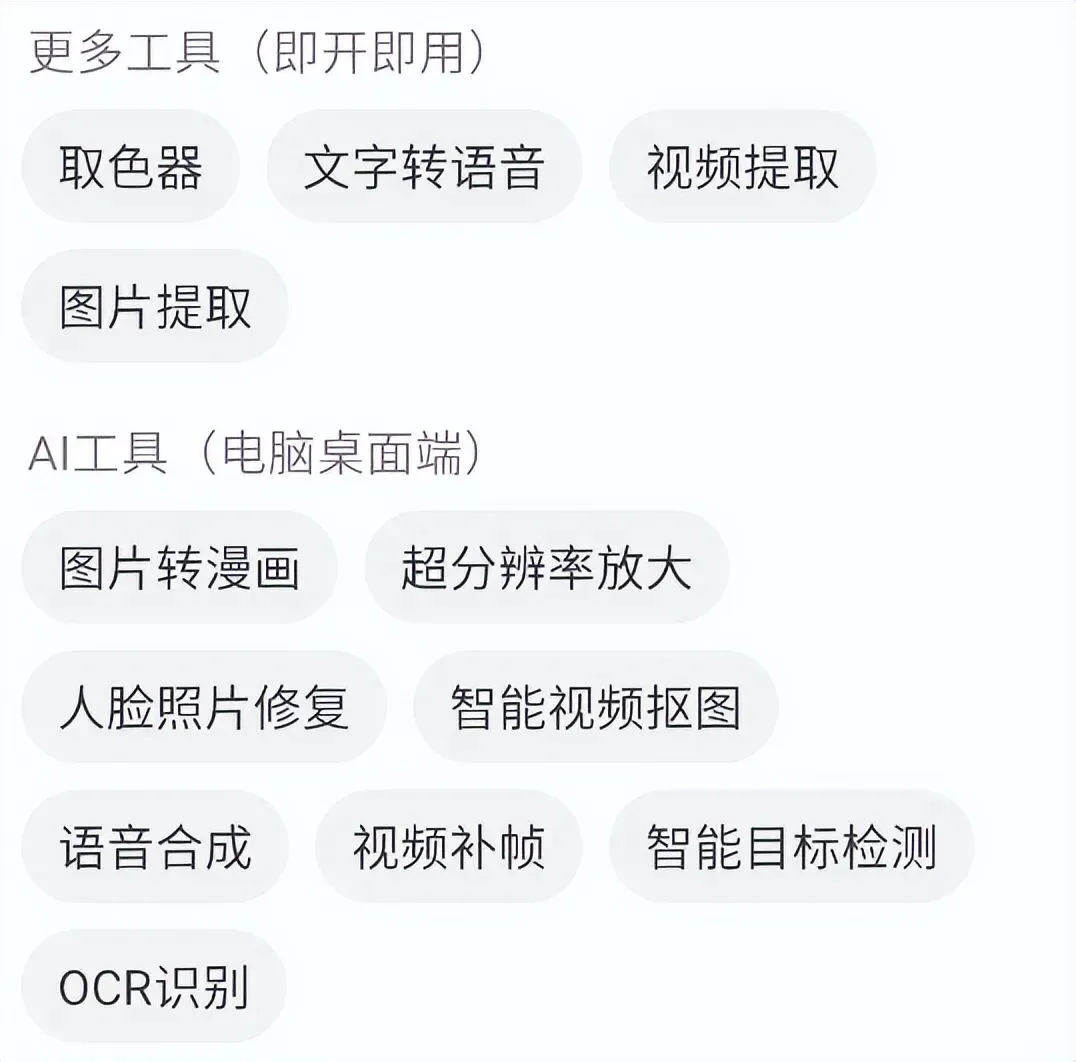 最后小编想再说一下AI工具的使用。在首页的右下角点击更多,可以发现超多AI工具,它包含了文本翻译、文字识别、取色器、文字转语音、视频图片提取、照片修复等一系列便捷的小工具。大家可以自行体验。