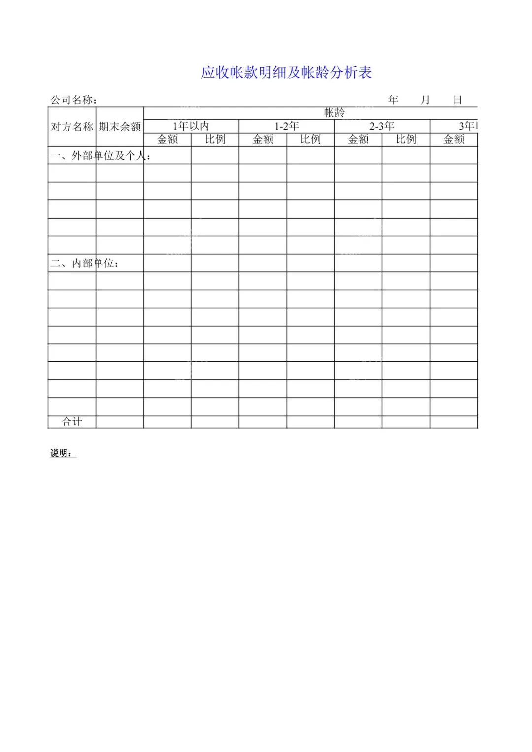本文档是一份专业的应收账款明细及账龄分析表模板,旨在帮助企业高效管理应收款项、把控资金风险。表格清晰划分外部单位及个人、内部单位两大类别,按1年以内、1-2年、2-3年、3年以上四个账龄区间,分别统计金额与占比,结构规范清晰。无论你是财务人员还是企业管理者,都能通过这份模板快速梳理应收款情况,精准掌握资金回收节奏,为企业资金健康运转提供有力支撑。
