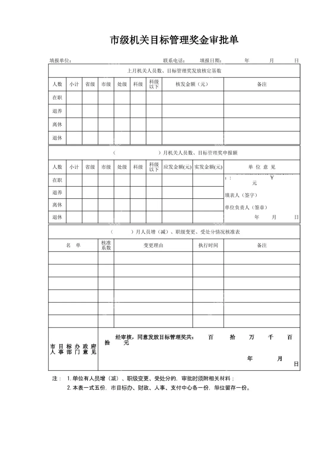 本文档是一份规范的市级机关目标管理奖金审批单,为机关单位奖金申报审批提供标准化流程指引。文档包含上月人员数及奖金核定基数统计、当月奖金申报额填报、人员增减及职级变更核准三大核心板块,清晰划分在职、退养、离休、退休人员的统计维度,明确应发、实发金额填报及单位审核、人事部门核准的流程要求。同时标注了审批需附材料及表单留存份数等注意事项,适合市级机关行政人员、人事专员用于规范完成目标管理奖金的申报与审批工作,确保奖金发放流程合规有序。