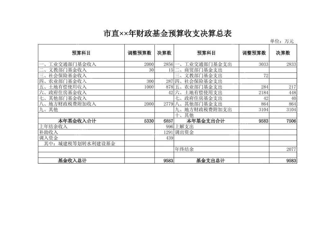 本文档是一份市直××年财政基金预算收支决算总表,清晰呈现该年度财政基金的收支执行情况。表格详细列示了工业交通、文教、农业等多部门基金的收入调整预算数与决算数,同时对应展示各部门基金支出的预算及实际执行数据;还汇总了本年收支合计、上年结余、补助收入、年终结余等整体收支结余情况,数据精准详实,一目了然。适合财政从业者、财务分析人员及相关管理者使用,为财政资金复盘、预算优化提供可靠的数据支撑。