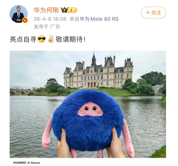 4月8日,华为终端BG CEO何刚在社交平台上发布了一张看似平常的照片:他双手托举玩偶,画面以第一视角呈现,构图鲜活而有温度。但左下角那个清晰的"HUAWEI AI Glasses"水印,却让整个科技圈瞬间沸腾。