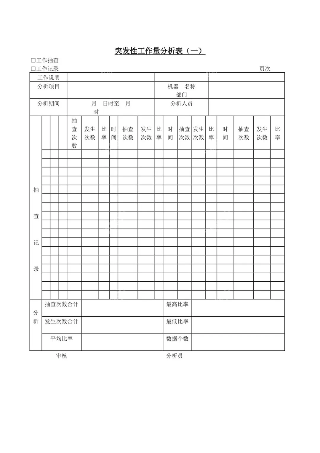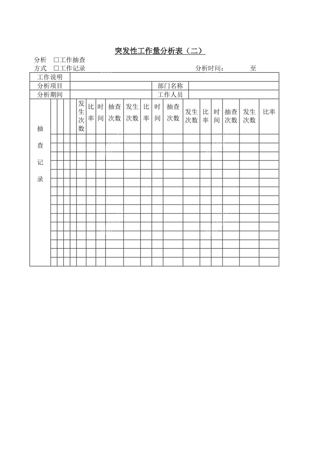 此为突发性工作量分析表(二),支持工作抽查、工作记录两种分析方式,可记录分析项目、期间、抽查次数、发生次数、比率等数据,助力工作量统计分析。