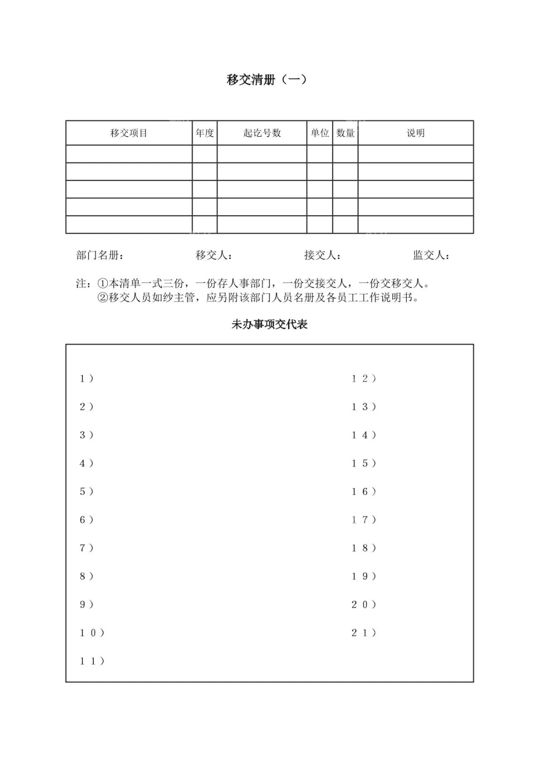 这份工作移交清册模板含移交项目登记、未办事项记录,明确移交、接交、监交人职责,一式三份,主管移交还可附人员名册及工作说明书,规范工作交接流程。