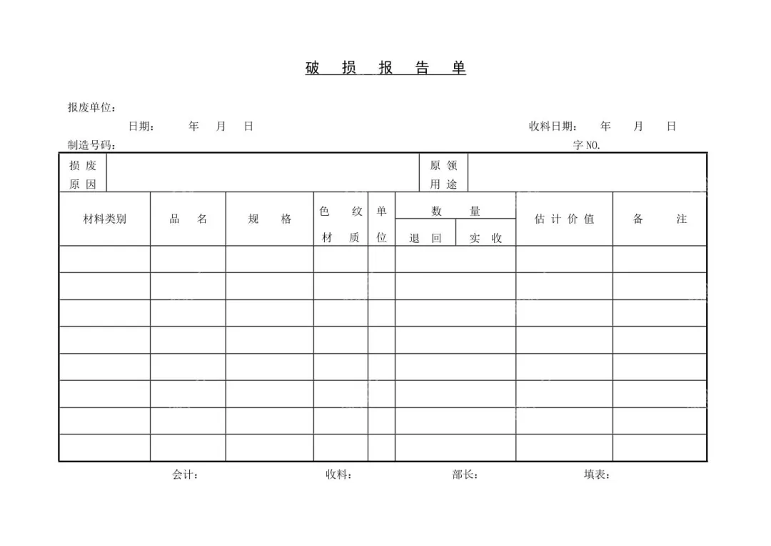 这是一份规范的破损报告单模板,涵盖报废单位、日期、报废原因、材料明细等核心栏位,适用于企业物资报废、破损退库的流程填报,助力企业资产管理规范化。