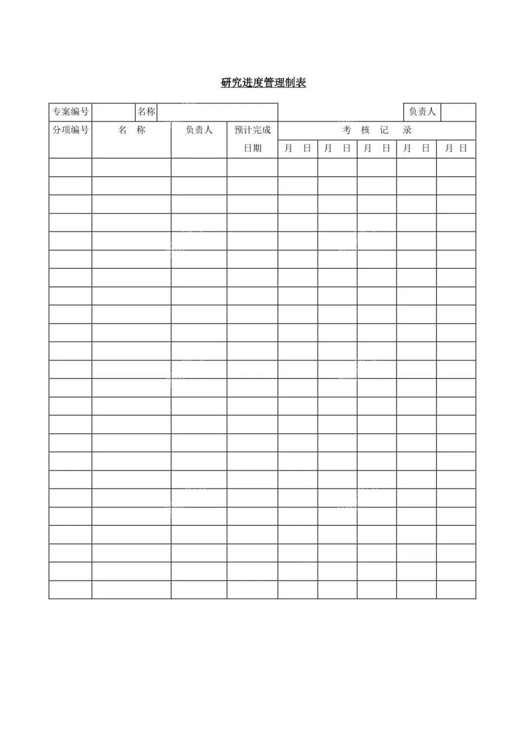 这是一份研究进度管理制表模板,包含专案编号、分项名称、负责人、预计完成日期及多时段考核记录栏,可用于规范研究项目的进度追踪与考核管理。