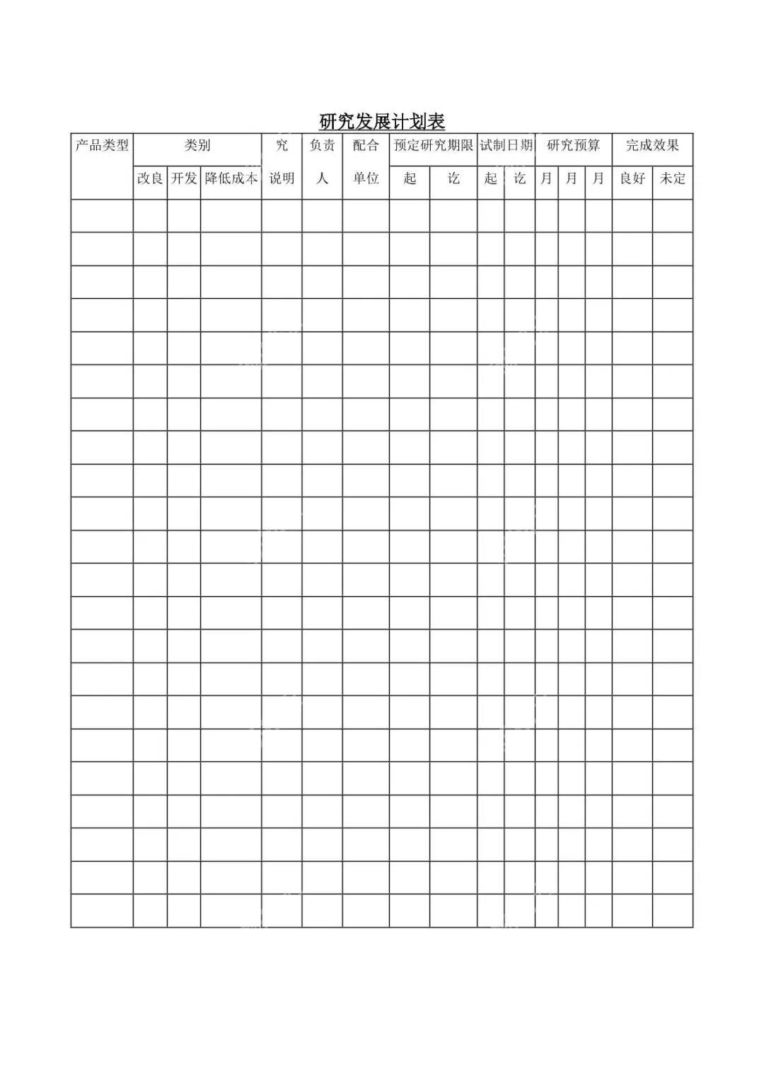 这是一份产品研究发展计划表空白模板,涵盖改良、开发、降本等研究类型,包含负责人、研究期限、试制日期、预算、完成效果等核心模块,可用于企业研发项目统筹管理。