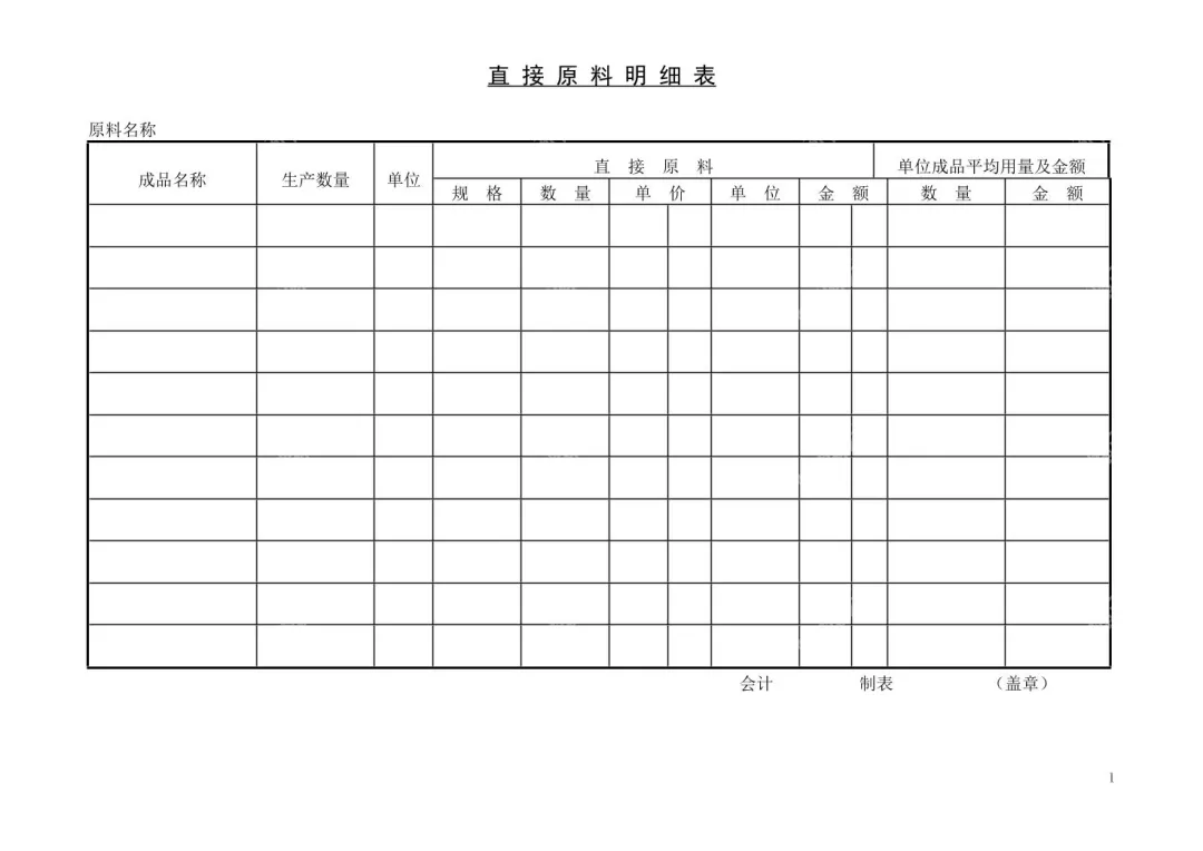这是一份直接原料明细表模板,涵盖原料名称、成品名称、生产数量、单位成品用量及金额等核心栏目,适用于会计核算与成本统计。