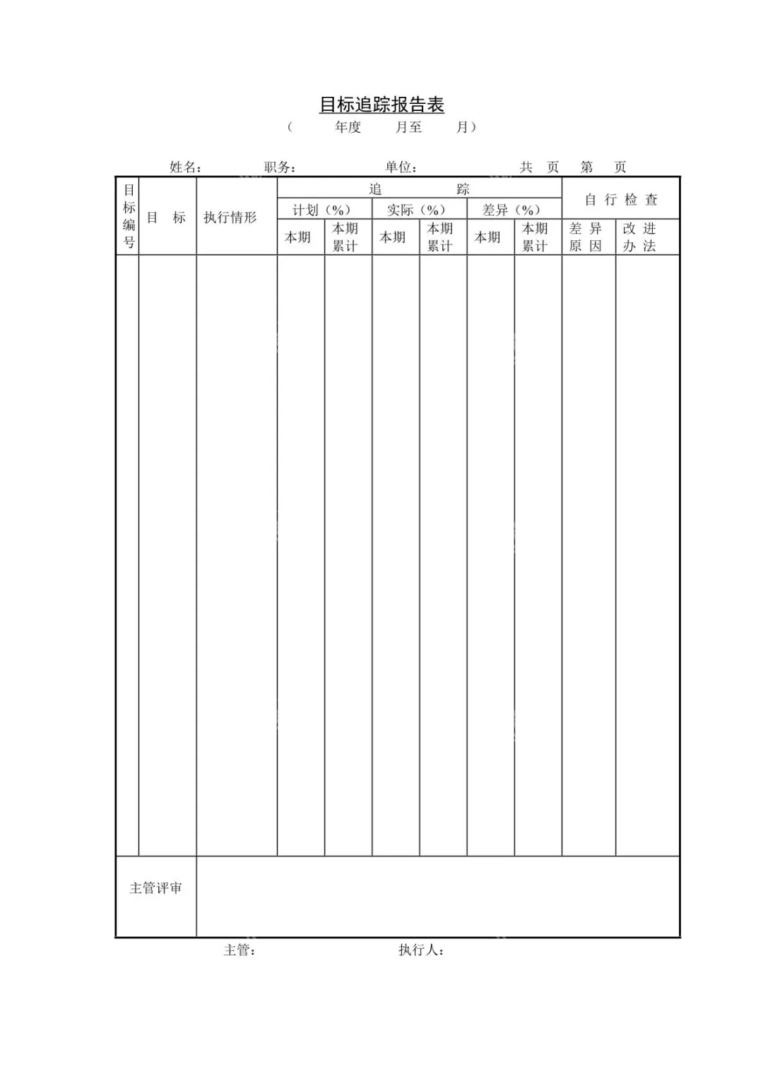 这是一款用于工作目标管理的追踪报告表模板,可记录目标执行情形、计划与实际完成占比、差异原因及改进办法,支持主管评审,助力工作进度管控。