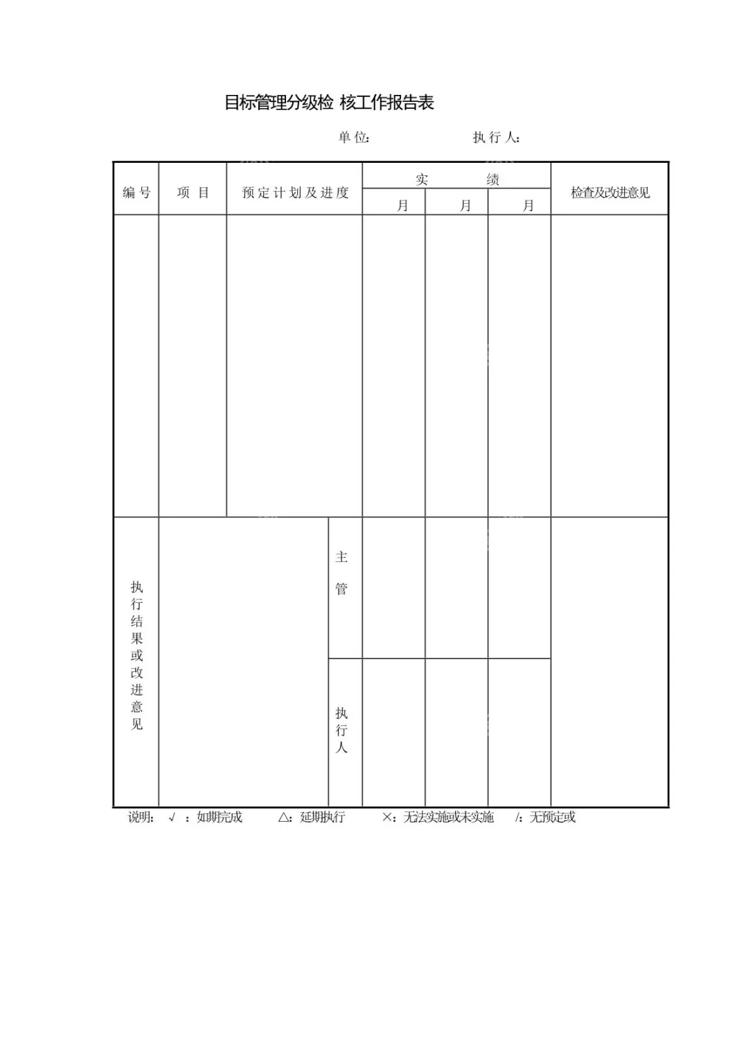 这是一份目标管理分级检核工作报告表,可用于记录项目预定计划、进度、实绩,标注完成状态,并填写检查及改进意见,助力目标执行管控。