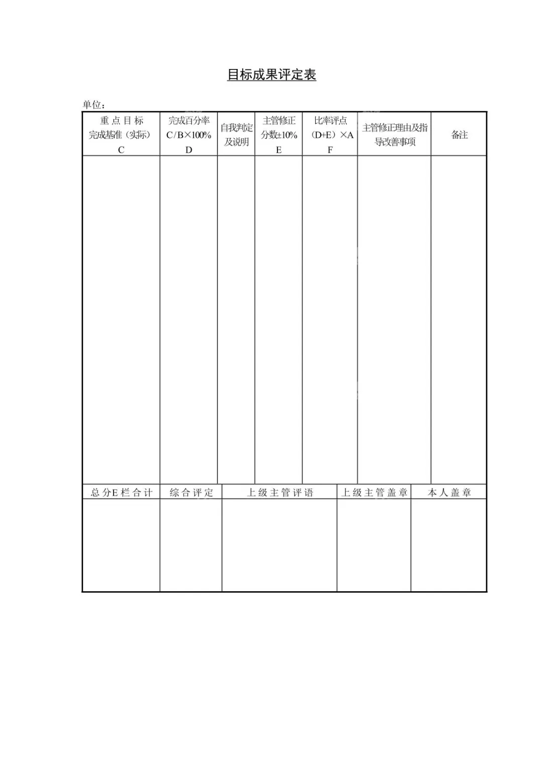 这是一份用于员工绩效评估的目标成果评定表模板,包含完成情况统计、自我判定、主管评分及指导等模块,可用于单位内部绩效评定工作。