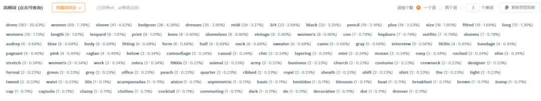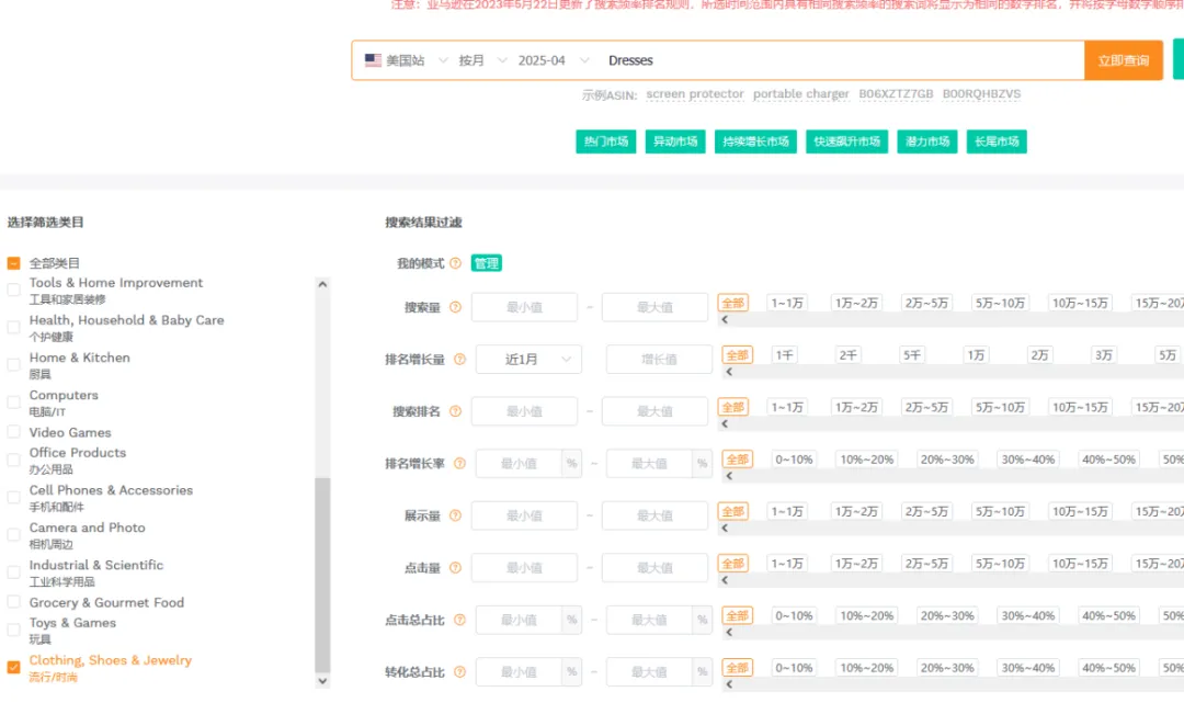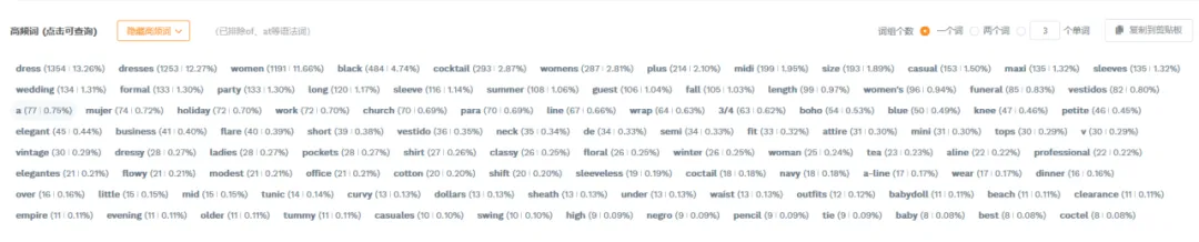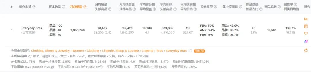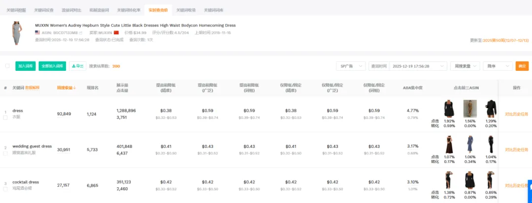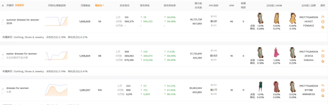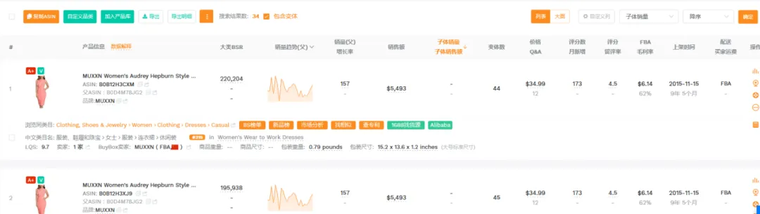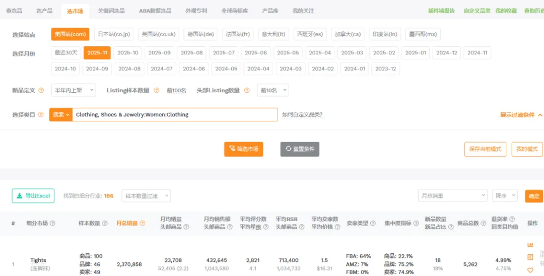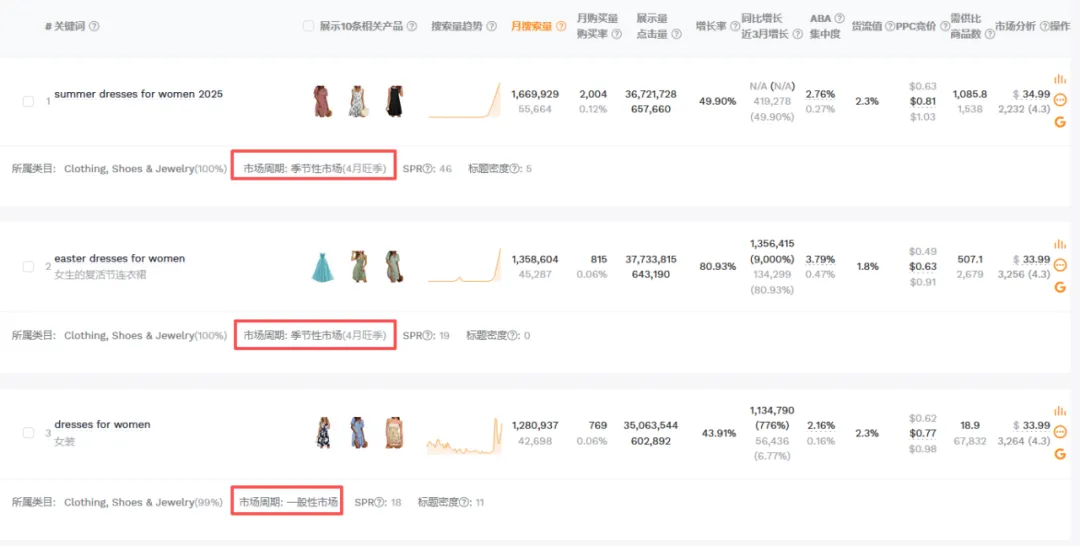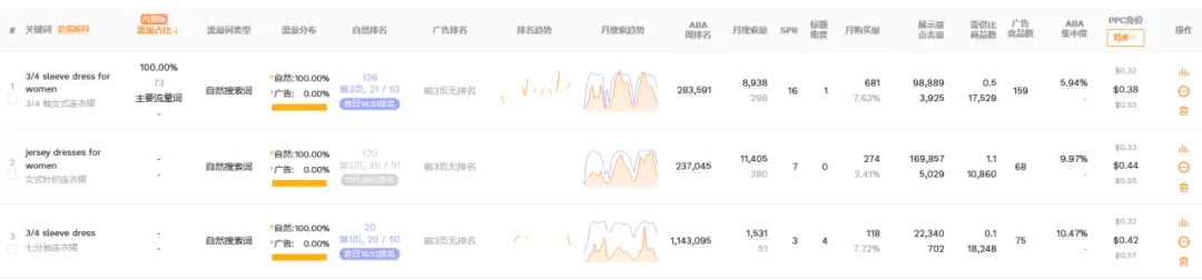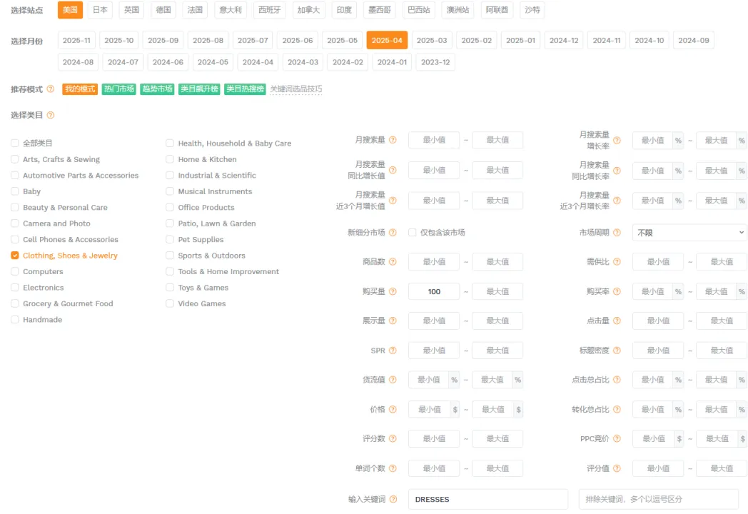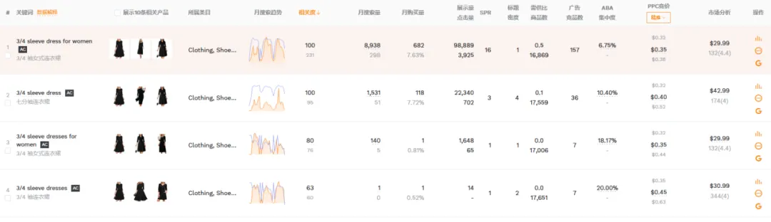1篇文章让你学会操作万能软件——卖家精灵大家好,我是白菜籽。今日就来讲解一下为什么每个新手卖家入行的时候都会被安利的软件——卖家精灵!这个也是白菜每次尝试新的软件之后,还是会保持卖家精灵会员的购买。希望看完这篇文章的你明白究竟为什么卖家精灵是那么多用户推荐的软件建议操作途径:选择市场->关键词选品->查专利->选竞品->查竞品选择你需要销售的目标市场,然后选择你想要销售的月份(最旺的时间点/销售该类型的产品最热门的时候),查看时间新品listing上架时间范围(检查该类目是否活跃/是否被市场垄断导致没有上新),检查头部链接的范本(检查是否被头部链接垄断整体销量)。例如25年10月份,最为热销的是 Everyday Bras的细分市场,但是品牌垄断头部链接已经去到95.7%,头部卖家垄断到97.7%,平均单价24.07.月均销售额明显被头部垄断为主。一翻研究下来,基本该类目被头部垄断明显不建议入场。从中挑选部分头部垄断比较少的类目+利润可观(退货率比较低)。下面类型的产品我们就挑选细分市场 Dresses 作为分析对象。从”市场“中我们挑选了Dresses类型的产品作为分析,热门时间为4月(思考确认样衣时间+做货时间+发货时间=预计4月份销售,因为每年的流行方向元素相同月份会比较相似因此选择25年4月作为26年4月开款方向)。根据你的想法填写目标市场中关键词的目标,例如购买量(希望一个月出多少单),商品数(多少个跟你竞争),月搜索量(一个月至少多少搜索),价格区间等按你想法来填写。下面出来的关键词会按照你输入的内容展示,更是会显示产品是季节性还是一般性。根据产品的月搜索量+月购买率。购买量 = 搜索量*购买率。确认ABA集中度(是否词关键词是被垄断),PPC竞价(推广成本),供需比(市场是供大于求还是求大于供),市场分析(了解销售价格是否有竞争力)根据展示的关键词可以大概展开你想要开售的产品初图。这里带一句ABA数据选品,可以通过竞品ASIN(得到关键词)以及关键词检查。那么为什么关键词选品以及ABA选品要分开呢?合在一起不行吗?他们核算的是两个维度的事情,例如ABA数据中的关键词是亚马逊后台工具的关键词“搜索频率排名”是按照客户的搜索的频率所衍生出来的数据。但是关键词排名主要展示是关键词搜索量(预测)的。需要两者重叠选品。卖家精灵中还能检查图像搜索外观专利(但是需要点数),根据你需要上架的产品的销售国家范围填写。还能通过关键词来搜索,如果不想使用点数可以看这篇文章。(需要自行检查专利)而且卖家精灵还有插件模式,通过插件模式看产品也能够检查专利问题。特别外观专利问题可能会延伸后面的TRO的侵权问题,还是需要提前规避。从前面的部分中选择完你需要进入的核心市场,关键词的时候。那么就要开始选择你的目标竞品了的。基本挑选逻辑是TOP中选1、5、10、20、50、75、100(适合标品)、125、150、200、300、400等。如果是服装,需要根据你的销售类型以及核心关键词的前排位置来挑选。如果你没有想要选中的产品也可以从这个部分选择类型产品(类目,热销时间),但是出现的产品如果是多变体形式就会全部都展示,用作查看就比较麻烦。从销售趋势得到淡旺季,价格以及QA,上架时间,FBA包装尺寸重量等。输入你想要搜索的核心关键词,填写你需要的内容(范围)下面出现的是TOP10相关产品,检查关键词跟你的产品是否相关。更能看到相关关键词的月搜索量,展示量,供需比,广告竞品数,ABA集中度,PPC竞价,市场价格分析。可以输入对应的竞品ASIN得到竞品主要的产品关键词内容。查看竞品的关键词的流量占比(知道他们哪个关键词比较注重),以及查看他们共同会打造的关键词(基本就是核心关键词)下面会根据你的产品给出你可以选择拓展的关键词的数量以及就内容。此处主要查看对应你需要打造的关键词位置的转化率(搜索转化率,点击转化率),CPA(需要花多少钱才能成交1单),ABA数据(搜索量,ABA集中度),广告数据(ACOS,PPC)主要是用做检查关键词是否值得强推,需要根据利润情况来核算广告效果。输入ASIN,选择要看这个产品推荐关键词/指定关键词。注意!此处我觉得是卖家精灵针对此产品可能投放的广告做出的不同维度的CPC建议。当然也可作为词库的选择。卖家精灵会通过子体进入关键词前三页作为搜索的维度来整理,具体可以查看流量词主要是通过哪个形式展示流量。SP--->主要推流关键词,如果是类似款产品可以往这个方面进行推广视频关键词--->做SBV、SPV广告中是否实用关键词投放品牌广告词--->SB广告词(不算关键词推广转化)可以看到产品Listing详情页关联流量位置曝光过该ASIN的产品数量及占比统计免费关联:看了又看、相似产品、看了还看、看了却买、捆绑销售、组合购买、更多相关、买了又买、品牌推荐根据需要查找的关联流量检查竞品的有什么产品是会被捆绑或者检查自家产品的流量是否准确。根据不同的时间维度检查竞品的出单关键词,有按照周维度以及月维度。能够看到主要竞品的出单词,预计会跟关键词反差会有重叠部分。但是出单关键词可以看到该链接出单核心词(可能跟流量入口有出入,但是不会相差很大)转化效果如果是无效曝光词,指ABA数据中有点击记录,但没有转化。但是!未必没用。可以看到BSR的排名变化,价格问题,销量变动以及评分变动。跟产品监控