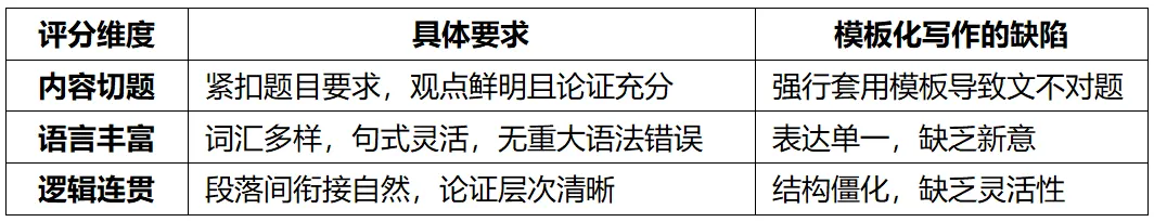 模板化写作虽能满足"结构完整"的基本要求,但因缺乏独特观点和个性化表达,往往只能达到中档水平。