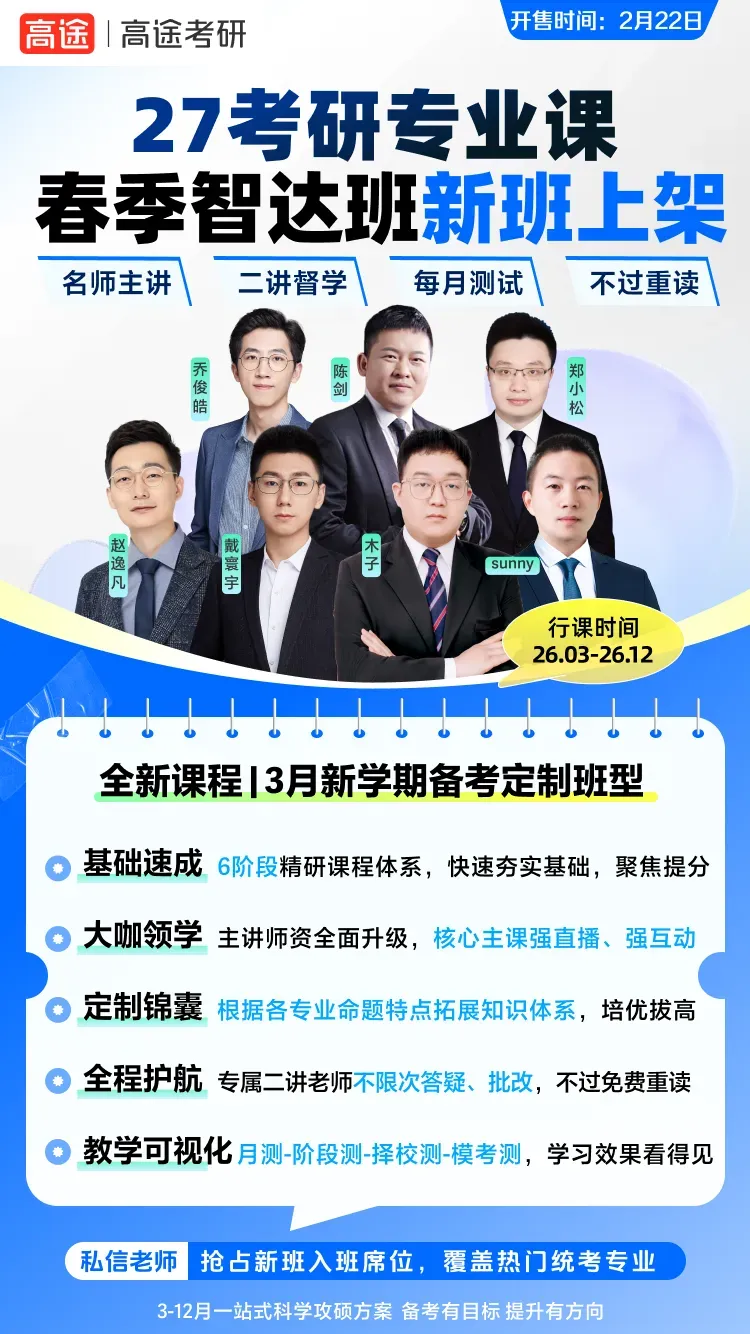 27考研的号角已经吹响,为了帮大家提升学习效率,找到适合自己的学习方案,高途考研推出了多种课程,适配27考研的同学,这里不仅有专业考研规划咨询讲师帮你选择上岸率更高的学校,更有已经上岸的学长学姐1v1帮大家伴学答疑,助你上岸~