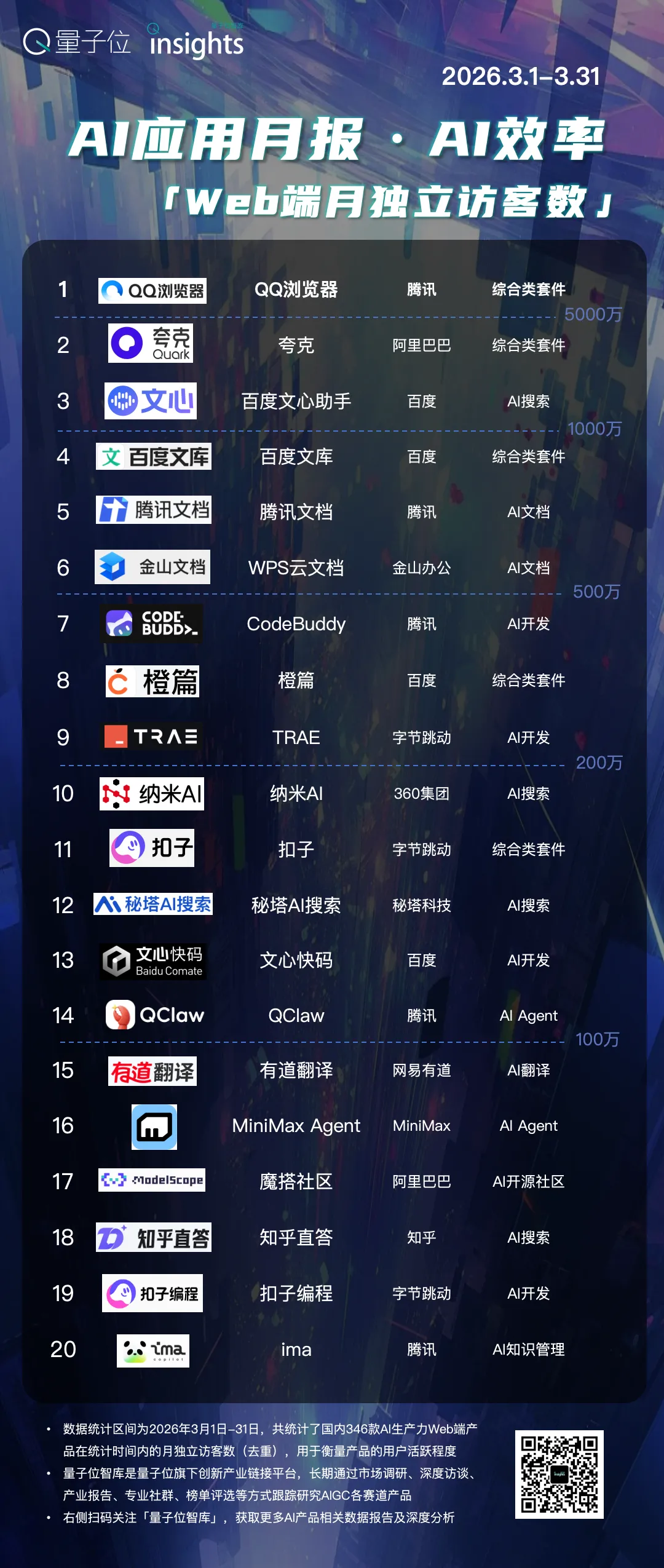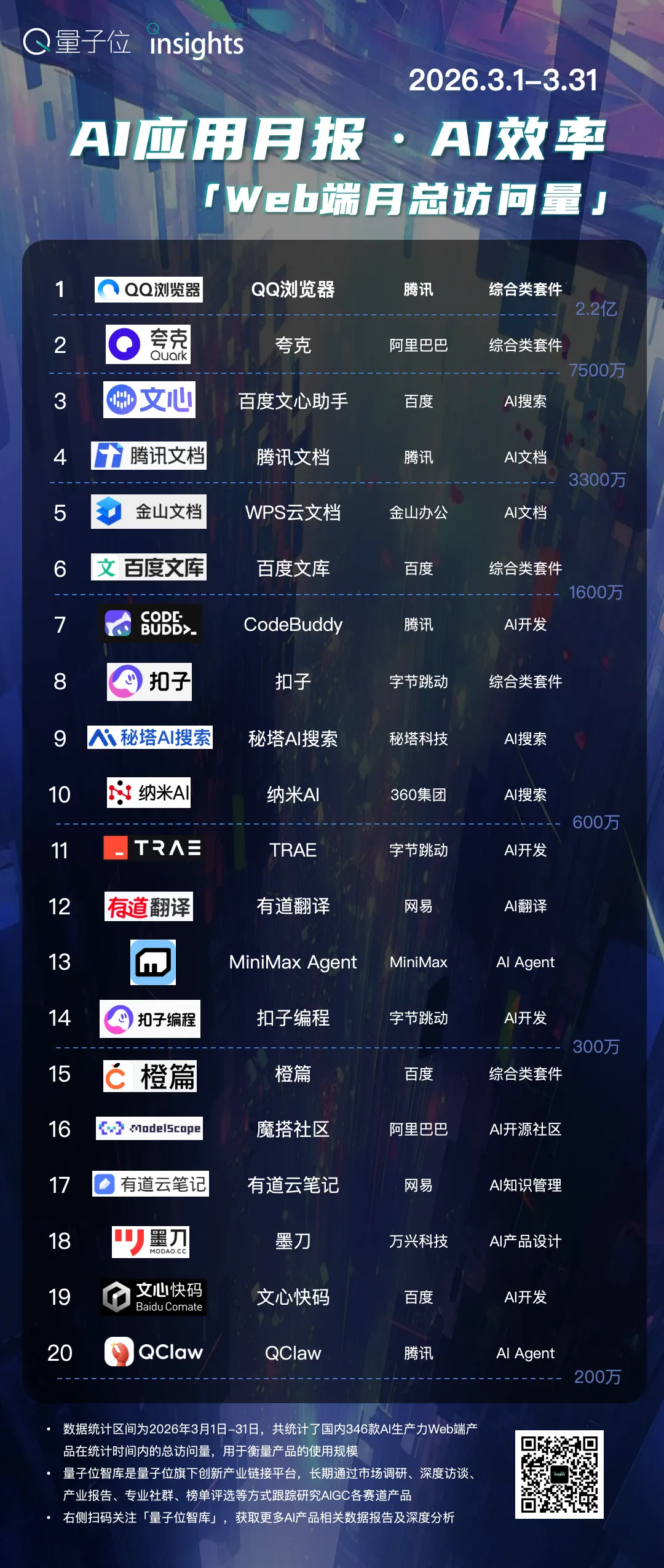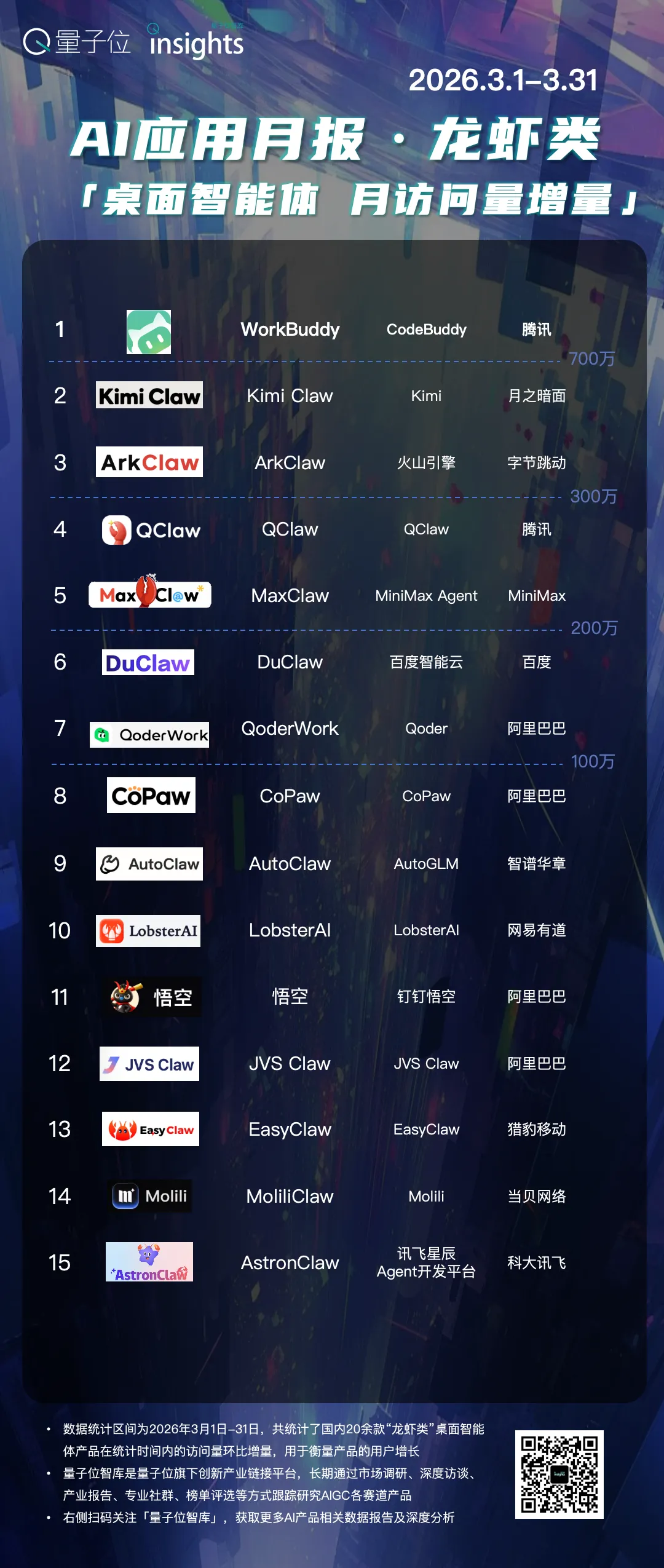 QQ浏览器继续霸榜,访问量和独立访客数皆领先于其他产品。WorkBuddy则领衔龙虾类应用的月访问量增量榜。