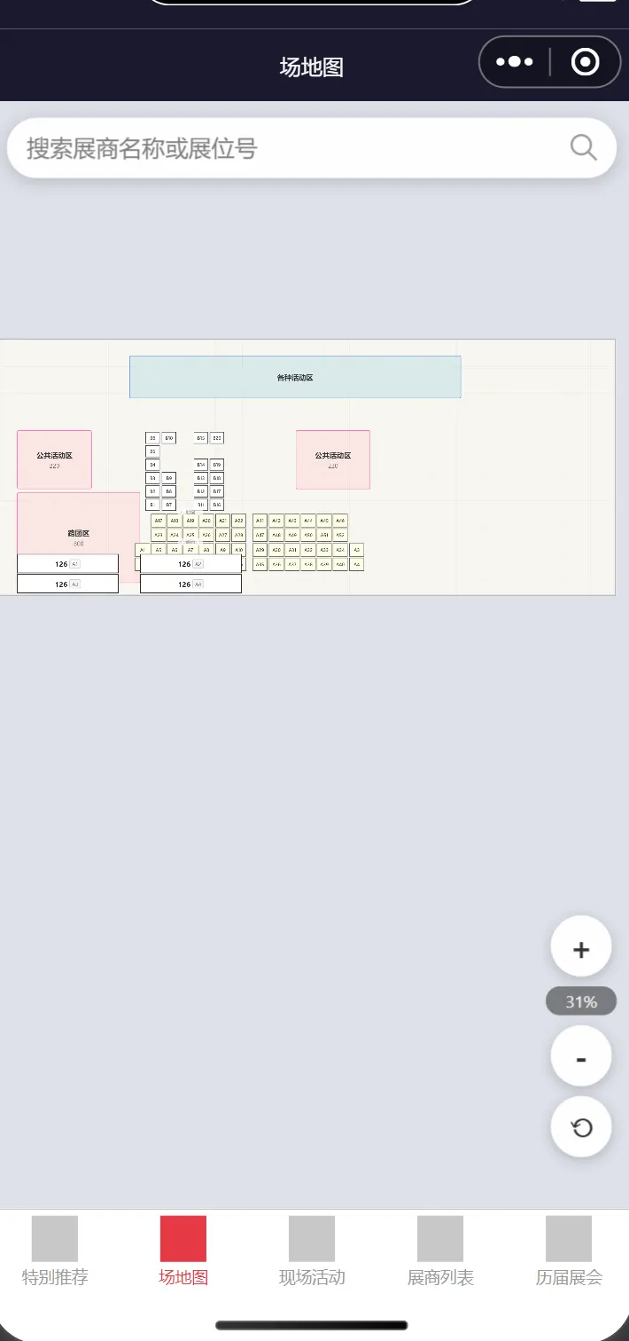 首页下方导览条第二个是场地图,可以无限放大,点击跳转企业企业详情,企业详情也可跳转场地图