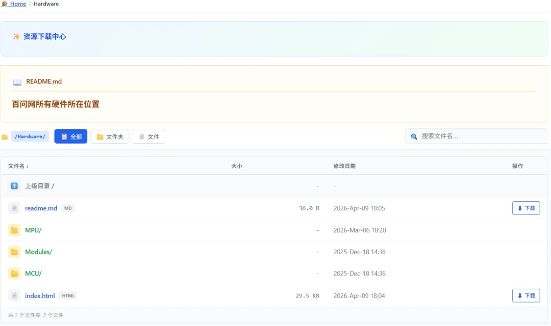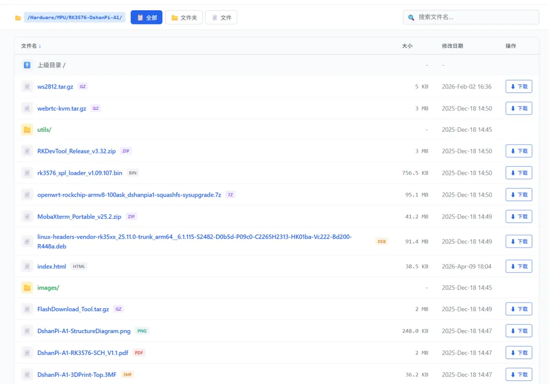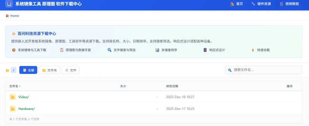百问网资源下载中心页面上线 dl.100ask.net 原理图 工具 镜像 等资料统一分类汇总,一键快速阅读!浏览器访问 dl.100ask.net 经常有同学临时想下载一下 默认的系统镜像,原理图,位号图等,但是又不想一次下载整个网盘压缩包,这些文件很小,又很常用,所以我们单独将此类文件按照硬件分类方式整理上传,做到即点即下,实时预览! 不用长时间等待。 当前版本只是预览版本,还有许多常用资料,板子都还未上传,请耐心等待完整整理,如果您对这个站点有那些好的建议,也欢迎文末留言!