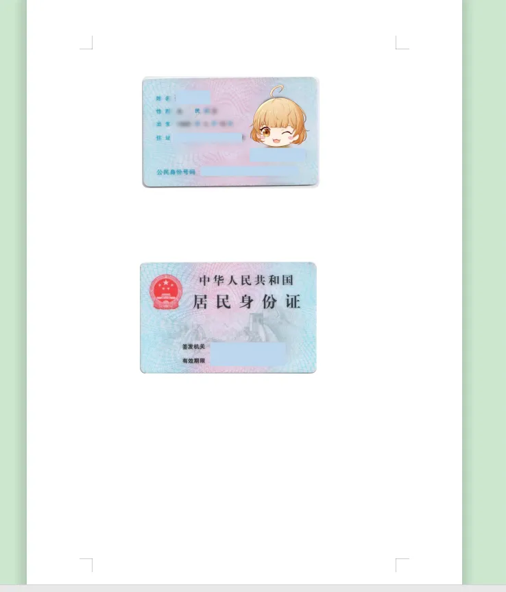 10.在同一页面上复制刚才做好的图框,重新填充另外一面的图片就可以得到完整版身份证扫描件,打印预览如下: