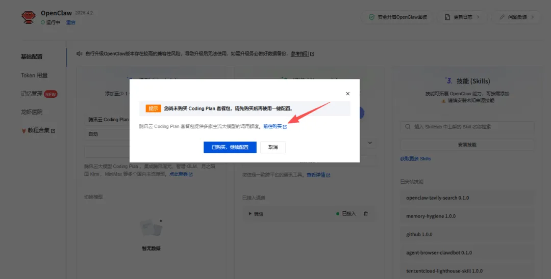 在模型配置的卡片中单击一键添加并应用,因为这个时候还没有购买Coding Plan套餐包,会出来一个弹窗,在弹窗中单击前往购买: