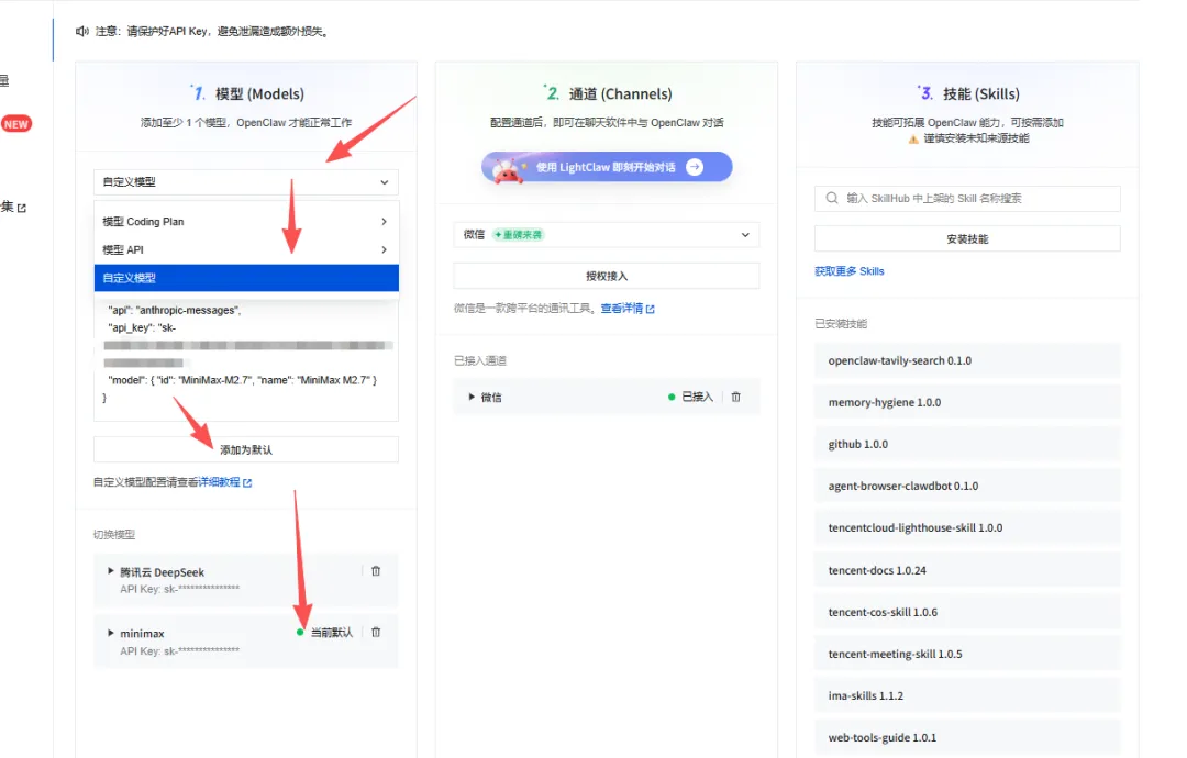 腾讯提供的OpenClaw配置面板目前支持腾讯混元、腾讯云DeepSeek、DeepSeek(深度求索)、月之暗面Kimi、智谱GLM、MiniMax、豆包、通义千问、文心一言等常用国内大模型API Key一键配置,也支持配置其他的自定义模型(如OpenAI GPT、Gemini、Claude等)。