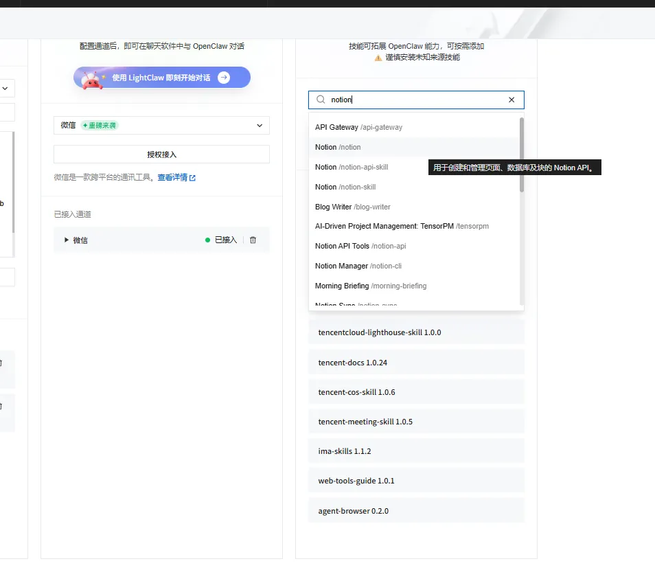 1. 可视化安装:在最新的 OpenClaw 配置面板中,已经支持了 Skills 的可视化配置。我们可以在输入框中直接输入从 Clawhub/Skills[2] 找到的插件名称。 2. 必备插件推荐: • agent-browser:这个神级插件,能让 OpenClaw 拥有浏览网页的能力。当你在微信发一个链接给它,它能自动打开网页抓取内容。• notion:用于连接你的 Notion 数据库,实现数据的自动化写入。