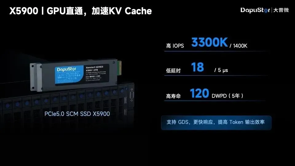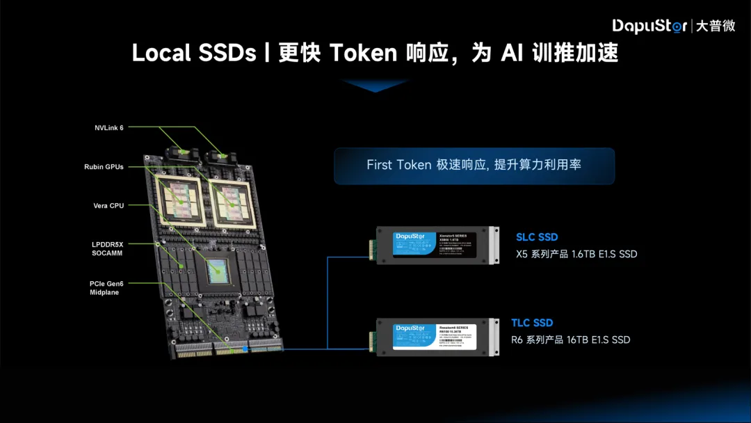 杨亚飞博士表示:“为实现 AI 时代下更快的 Token 生成与响应,大普微通过fast SSD/TLC SSD产品组合(代表产品有X5系列fast SSD、R6系列TLC SSD),凭借超高 IOPS 和极低时延,节省算力和成本。”