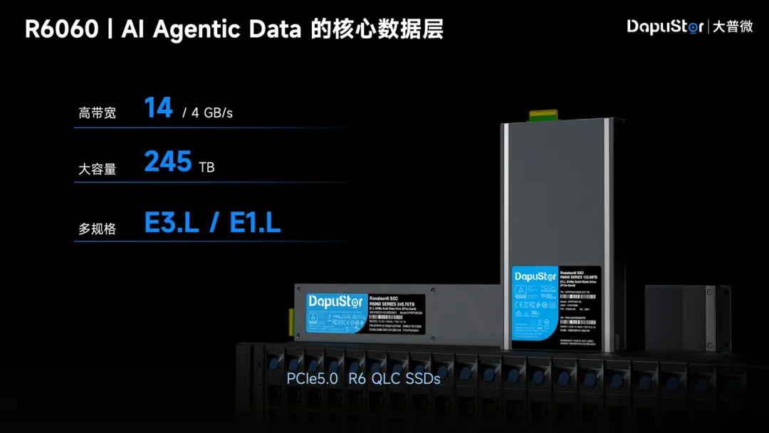 随着AI数据规模持续增长,大容量、高密度存储成为关键基础设施。大普微推出R6060 PCIe 5.0 QLC SSD,实现从30TB到245TB的容量覆盖,为AI数据资产提供高性价比承载能力。