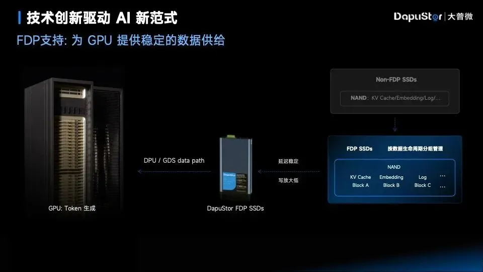 FDP:支持FDP功能的SSD,可优化数据分布,降低写放大,提升稳定性 ,为GPU提供稳定的数据供给。