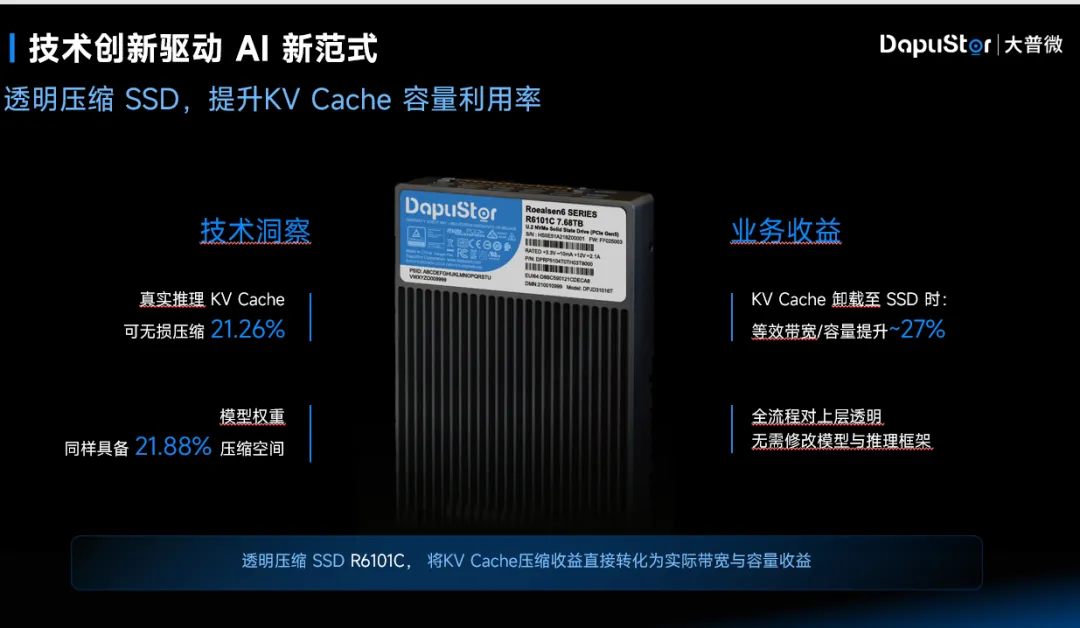 KV Cache 透明压缩:透明压缩 SSD R6101C,将KV Cache压缩收益直接转化为性能和用户容量的收益。