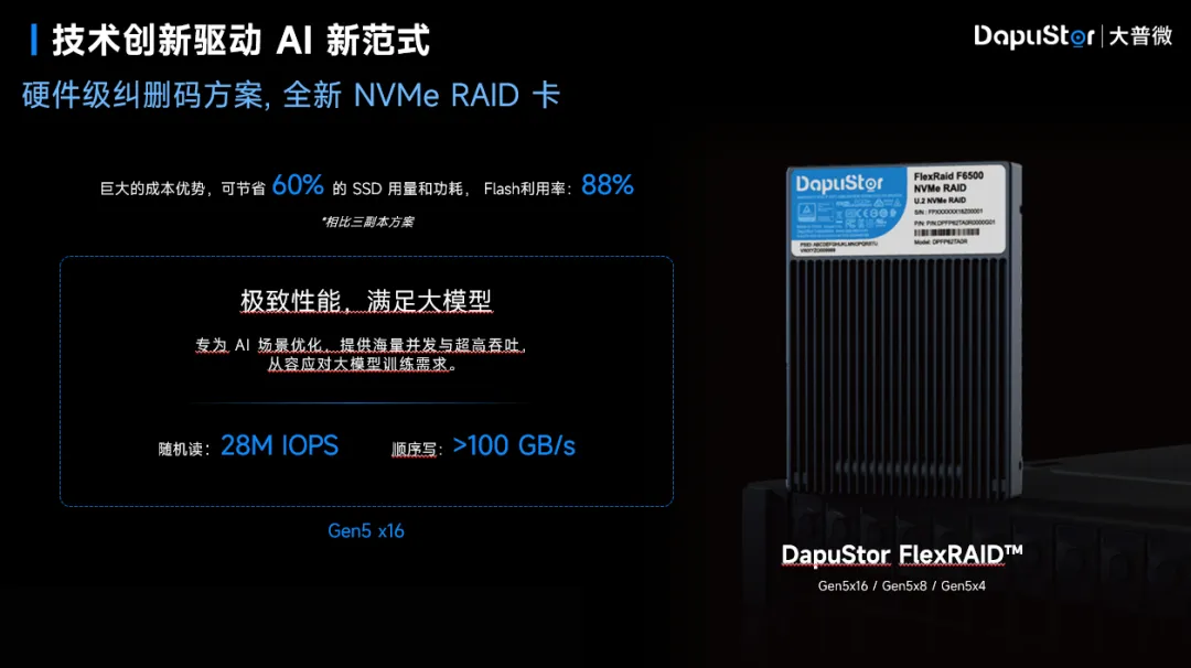 硬件级纠删码方案:大普微全新NVMe RAID卡FlexRAID,专为 AI 场景优化,提供海量并发与超高吞吐。