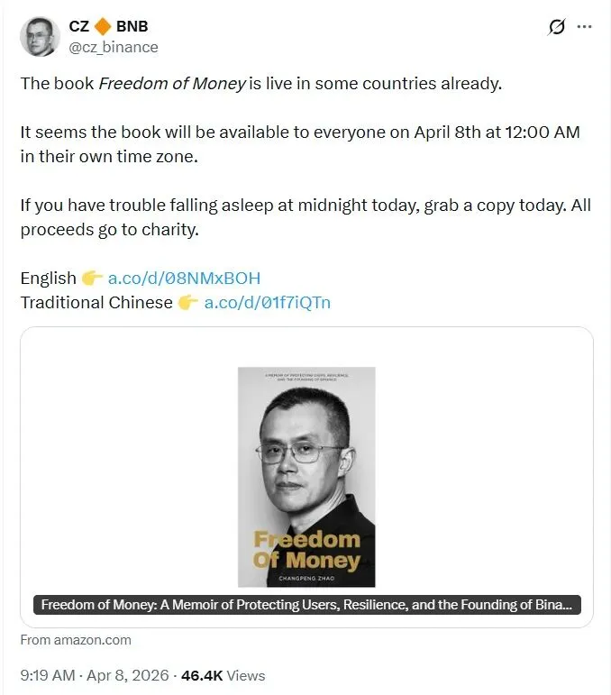 2026年4月8日,CZ的首部完整自传《Freedom of Money》(中文版《币安人生》)正式发行。
