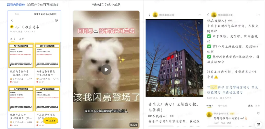 关键词通过后,可在抖音、快手、小红书、B站、微博、知乎等社交平台发布招聘笔记,或者通过截流等方式完成拉新。
