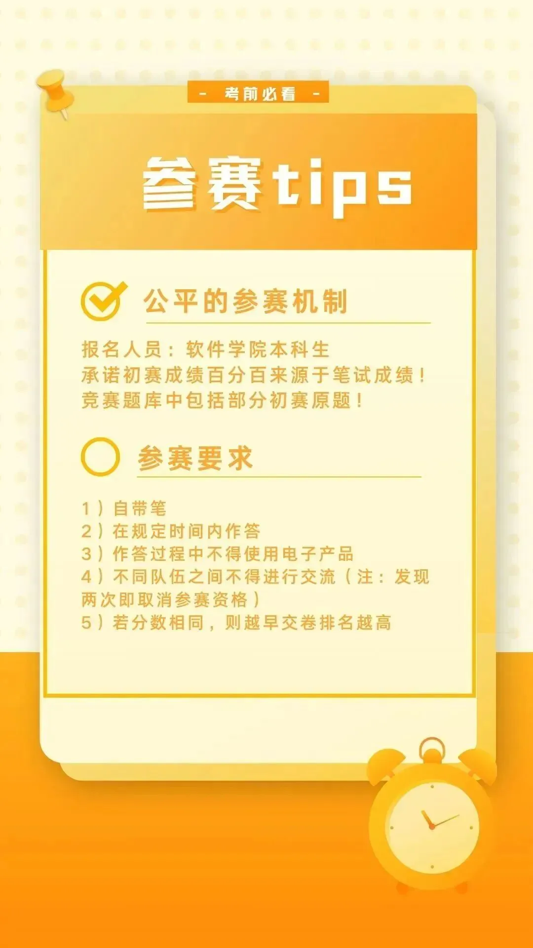 本轮比赛采取初试和复试的比赛方法,将题库分成初级题,中级题,高级题三个等级难度,其中初赛为60分钟线下答题,取前六名晋级。决赛则为120分钟现场答题,具体问题可以加入通知群等候具体安排。