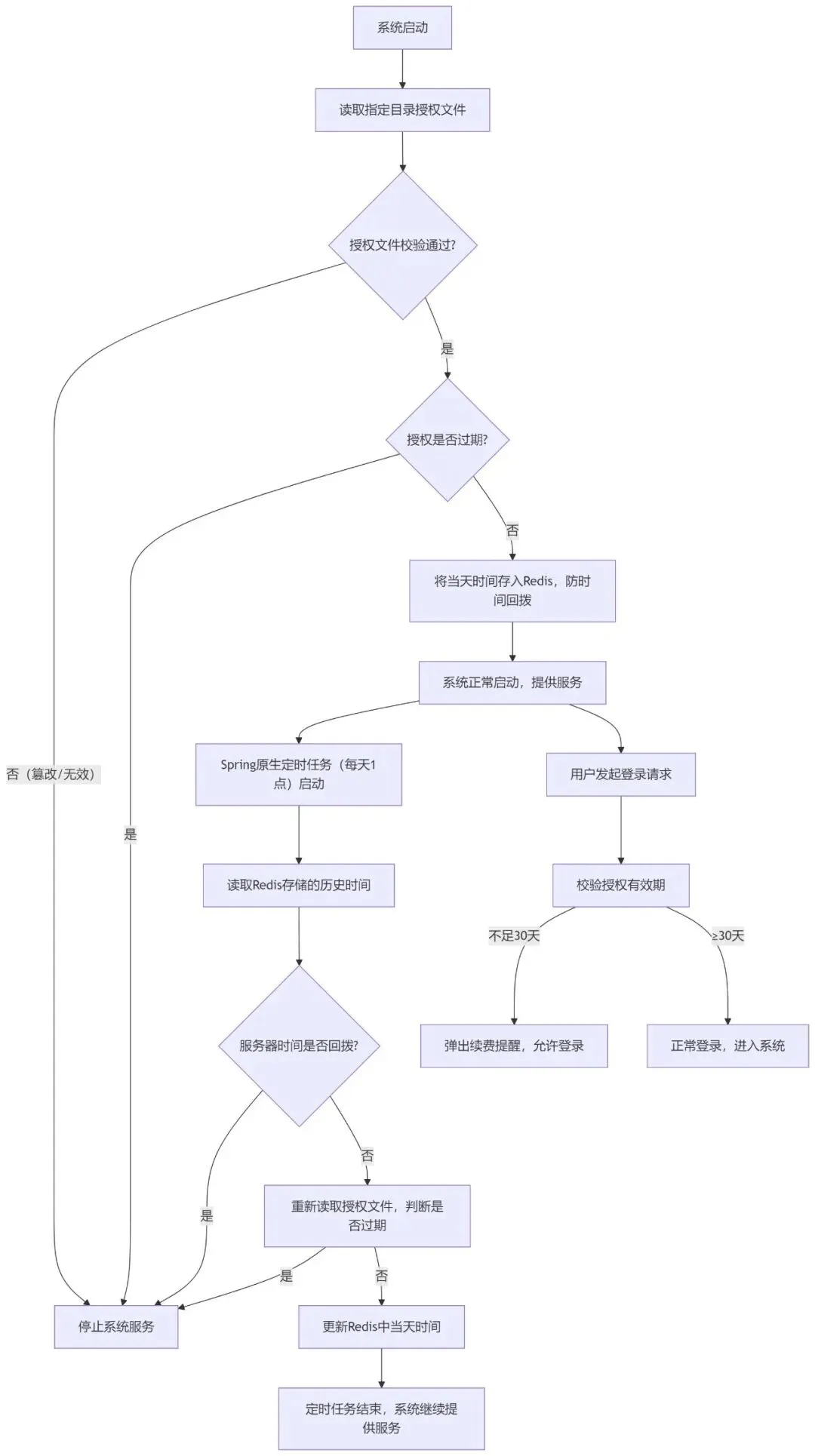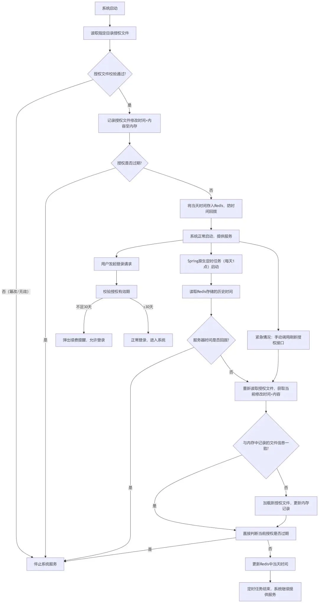 授权文件信息记录:系统第一次读取授权文件时,同步记录文件的修改时间和文件内容(含签名串),存储在内存中; 定时任务文件校验与重新加载:每天定时任务执行时,不仅检测过期时间,还会重新读取授权文件,对比当前文件的修改时间、内容与内存中记录的信息,若存在差异,立即加载新的授权文件,无需重启系统; 手动刷新授权接口开发:针对授权到期最后一天续费的紧急情况,开发手动刷新授权文件接口,若出现时间差导致的异常,可通过该接口手动触发授权文件重新加载,快速解决问题;