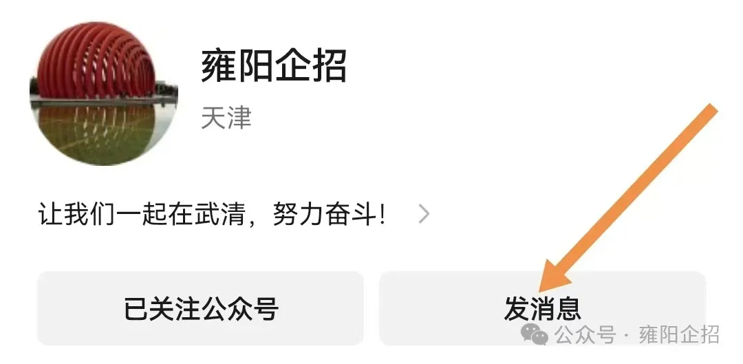 办法二:进入武清招聘大群,进入方法:识别下方二维码,关注“雍阳企招”,然后点击发消息即可看到拉群二维码。