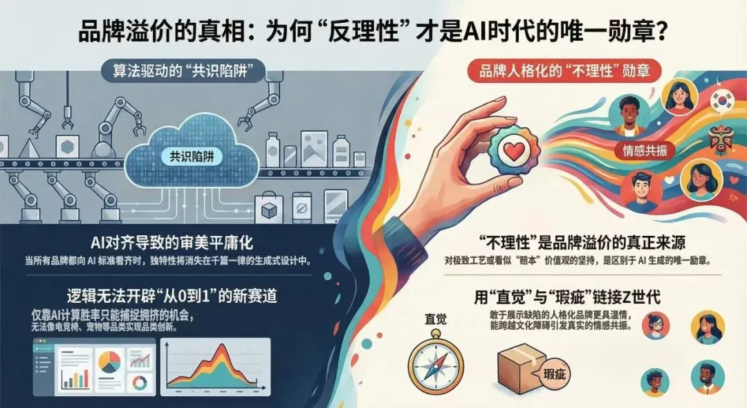 如今,这个就连审美都被AI对齐的时代,如果你仍保留对某个非主流设计、某种极致工艺或者是某种看似赔本赚吆喝的价值观的坚持,才是你区别于千万个AI生成的品牌的唯一勋章,这种不理性恰恰就是品牌溢价的真正来源。