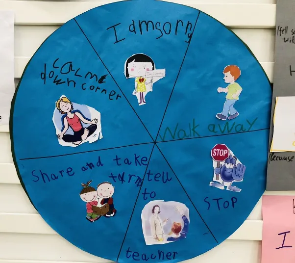 在这个过程中,孩子们会一起头脑风暴列出 “What can I do?” 的答案选项,然后通过制作转盘来解决生活中遇到的难题。比如:和朋友发生争吵怎么办?,在“解决矛盾”转盘中,可以是“主动道歉”、也可以是“告诉老师”或者“冷静一下”等。我们希望孩子能够辩证地看待问题,多角度思考问题解决的方法。