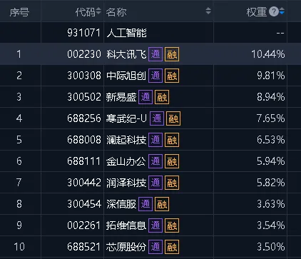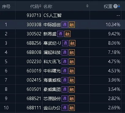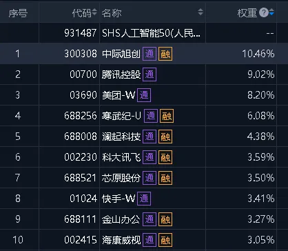 AI 核心龙头指数,包含腾讯、美团等港股映射,但以 A 股成分为主导。行业分布与CS人工智类似,大市值、流动性高、业务成熟度高,是ai领域的核心资产。