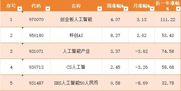 历史表现看,科创 AI(950180)以 8.27% 的周涨幅领跑,显示出极强的短期爆发力;创业板人工智能(970070)紧随其后。所有指数在近一年都取得了正收益,其中创业板人工智能(970070)的涨幅达到 111.22%,充分体现了 AI 赛道的高成长性。