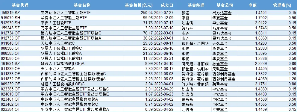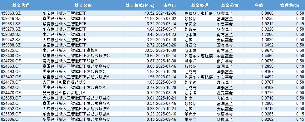 跟踪创业板人工智能(970070)的有21只,其中ETF有7只,规模最大的为华宝创业板人工智能ETF(159363.SZ),规模43.52亿;场外基金有14只,规模最大的为南方创业板人工智能ETF联接A(024725.OF)