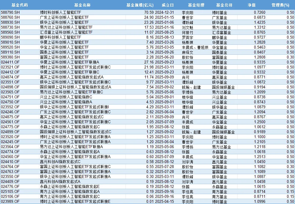 跟踪科创AI(950180)的有39只,其中ETF有10只,规模最大的为博时科创板人工智能ETF(588790.SH),规模70.59亿;场外基金有29只,规模最大的为华夏上证科创板人工智能ETF联接A(024411.OF)。