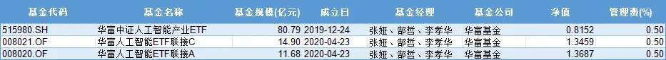 跟踪人工智能产业(931071)的有3只,其中ETF有1只,规模最大的为华富中证人工智能产业ETF(515980.SH),规模80.79亿;场外基金有2只,规模最大的为华富人工智能ETF联接C(008021.OF)。