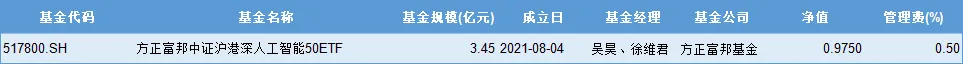 跟踪SHS人工智能50人民币(931487)的有1只,为方正富邦中证沪港深人工智能50ETF(517800.SH),规模3.45亿。